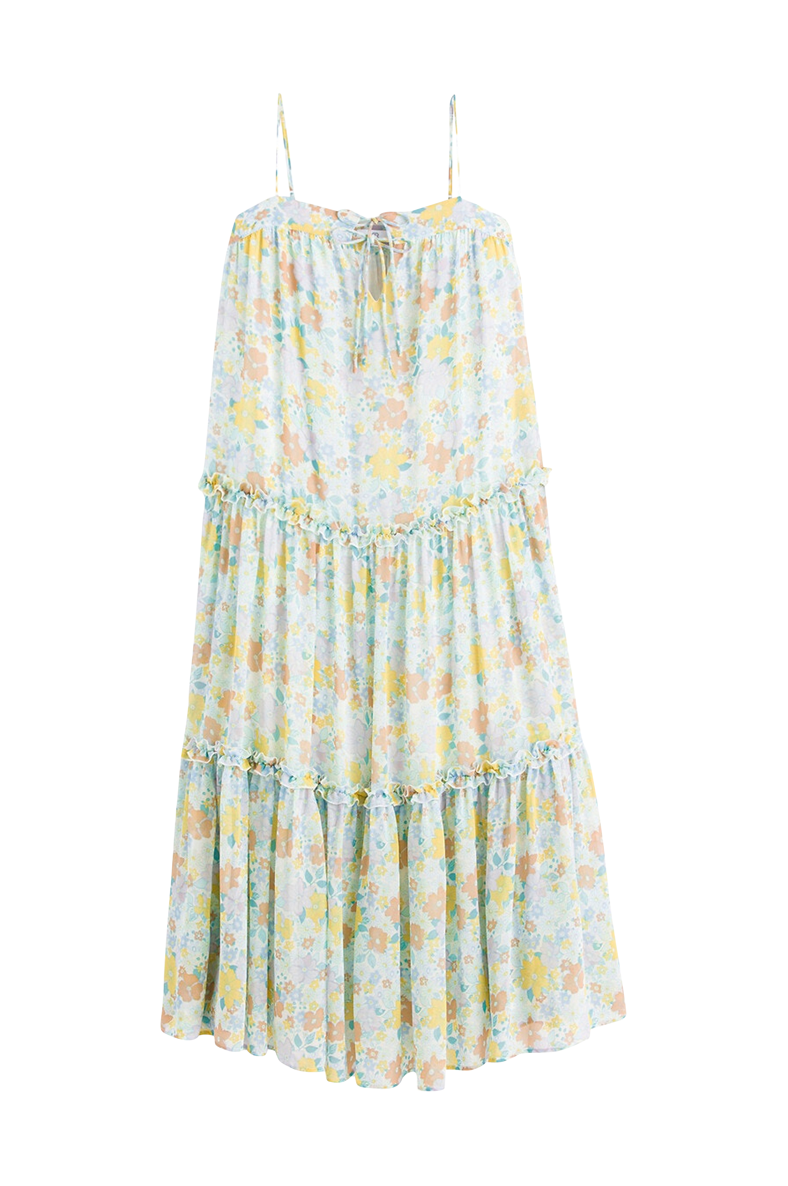 Lang kjole i luftigt materiale med blomstermønster. Detaljer