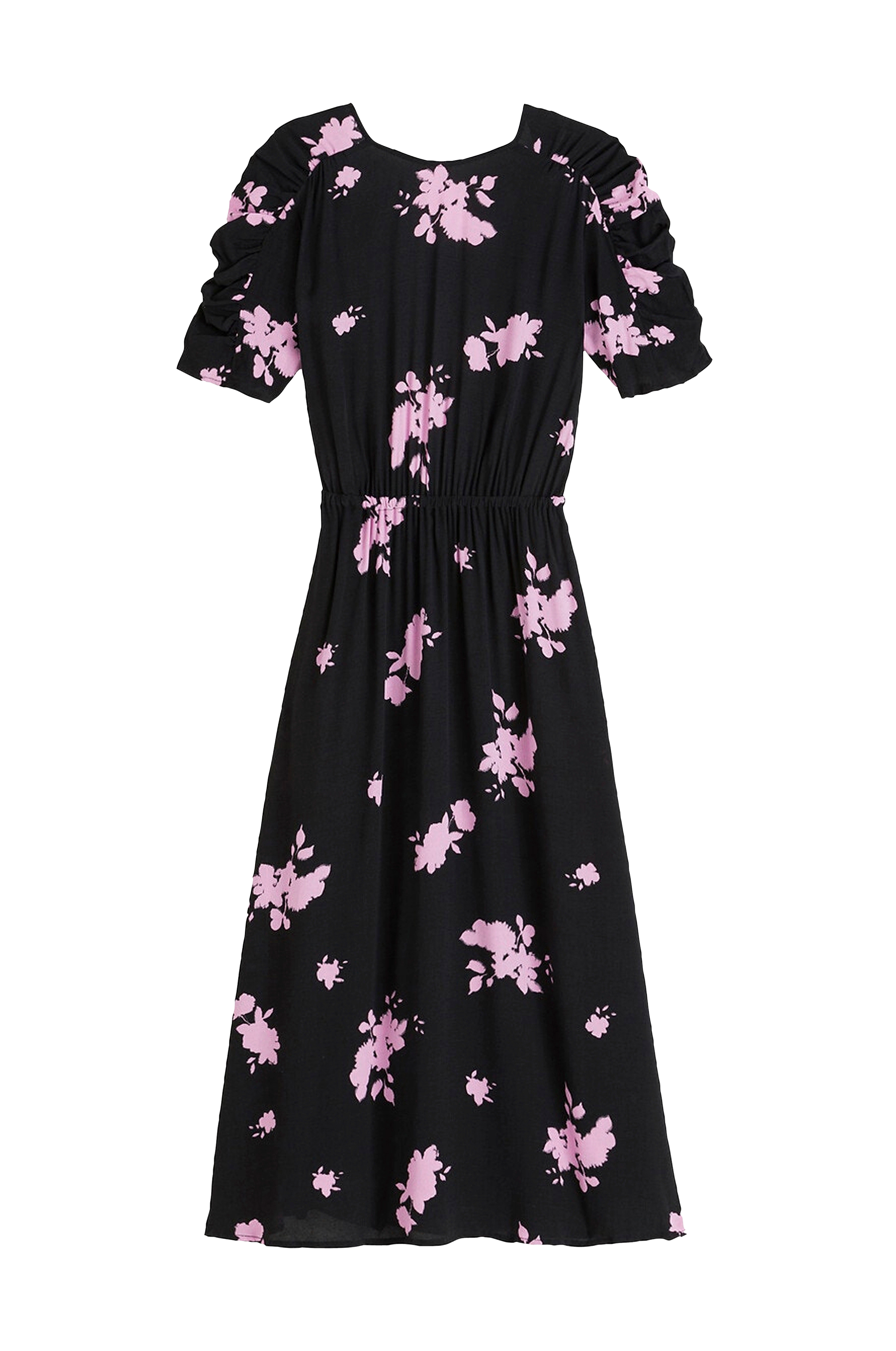Lang, feminin kjole med elegant blomstermønster. Smuk udskæring med bar ryg. Rynkede ærmer, elastik i taljen og to lommer. Romantisk model i bohemestil.