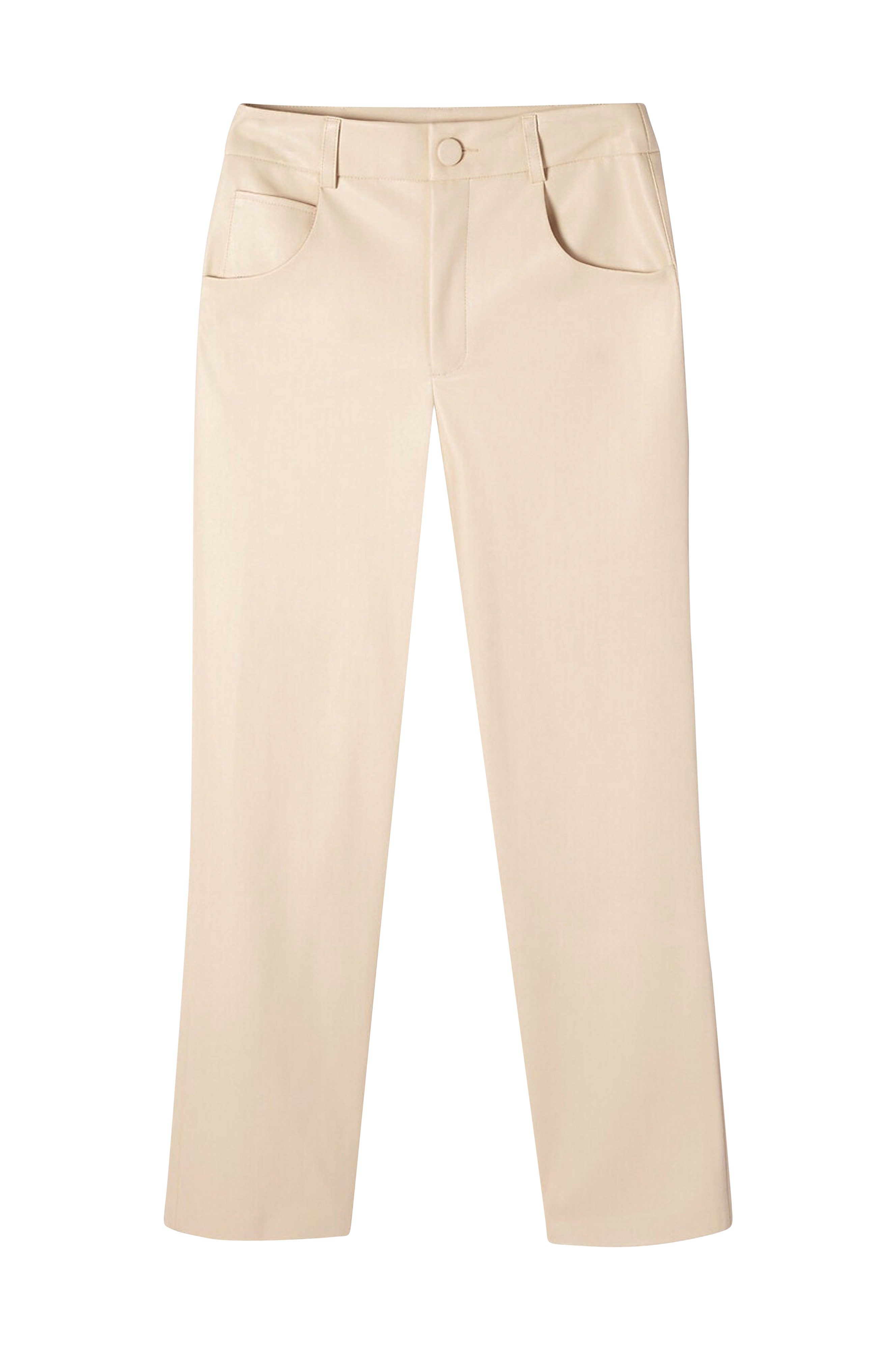 Buks i imiteret skind. 5-lommemodel i rocket stil. Detaljer - Lige model - Normalhøj talje Materiale og vaskeanvisning - 100% polyester - Finvask 30° - Tåler ikke strygning/tåler ikke blegemiddel - Tåler ikke tørretumbling - Tåler ikke kemisk rens Yderligere information - Linning med stropper - Gylp med lynlås og knap - 2 sidelommer - 2 påsyede baglommer - Benlængde 65 cm, vidde forneden 20 cm, i str. 38