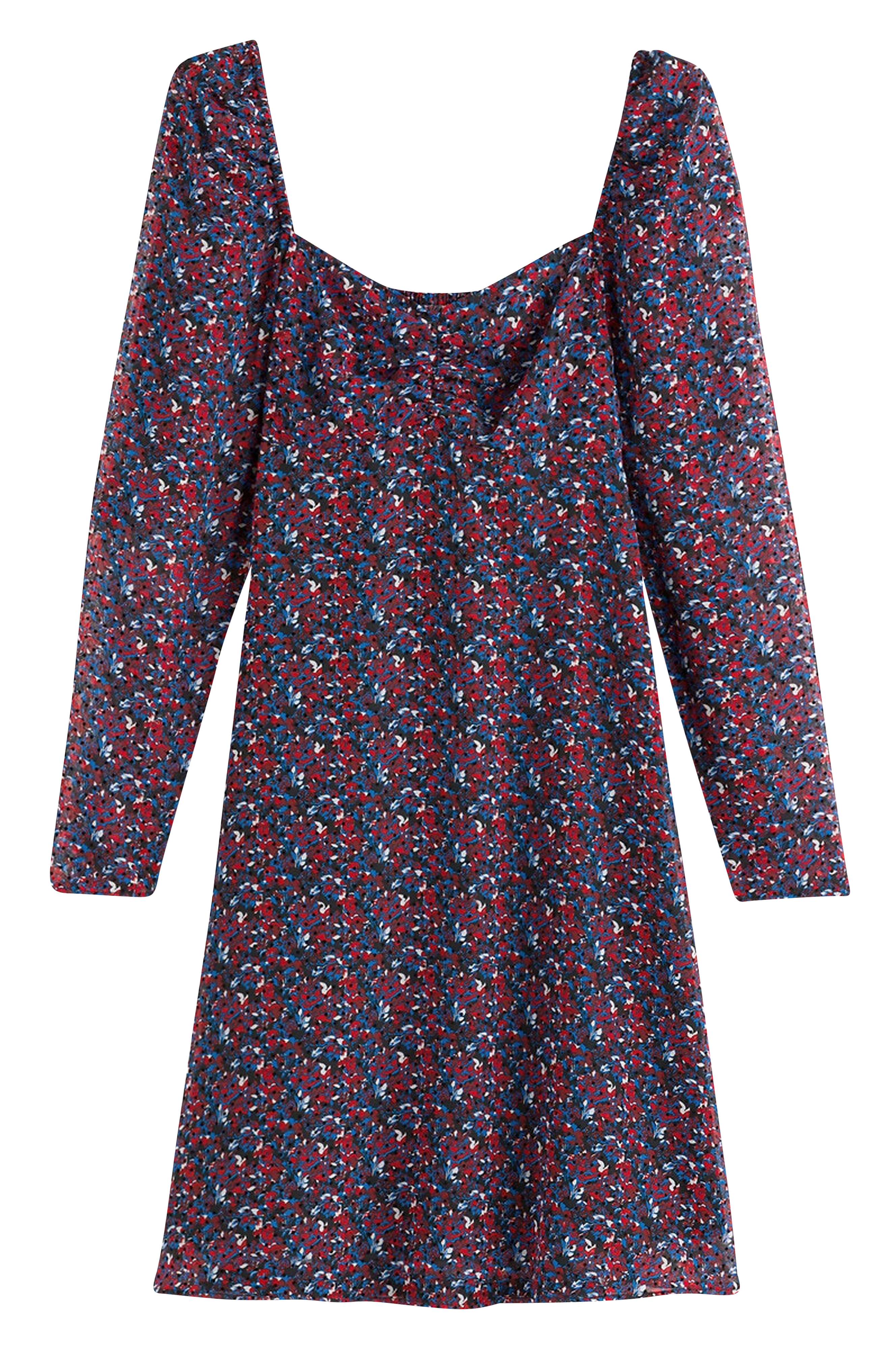 Kjole i britisk stil, med inspiration fra 70'erne. Trendy model med originalt mønster. Detaljer - A-formet model - Kort model - Langt ærme - V-udskæring foran - Kantet udskæring bagpå - Blomstermønster - Længde 115 cm i str. 38 Materiale og vaskeanvisning - Primært materiale: 100% polyester - For: 89% polyester, 11% elastan - Finvask 30° - Stryges ved lav temperatur/tåler ikke blegemiddel - Tåler ikke tørretumbling - Tåler ikke kemisk rens