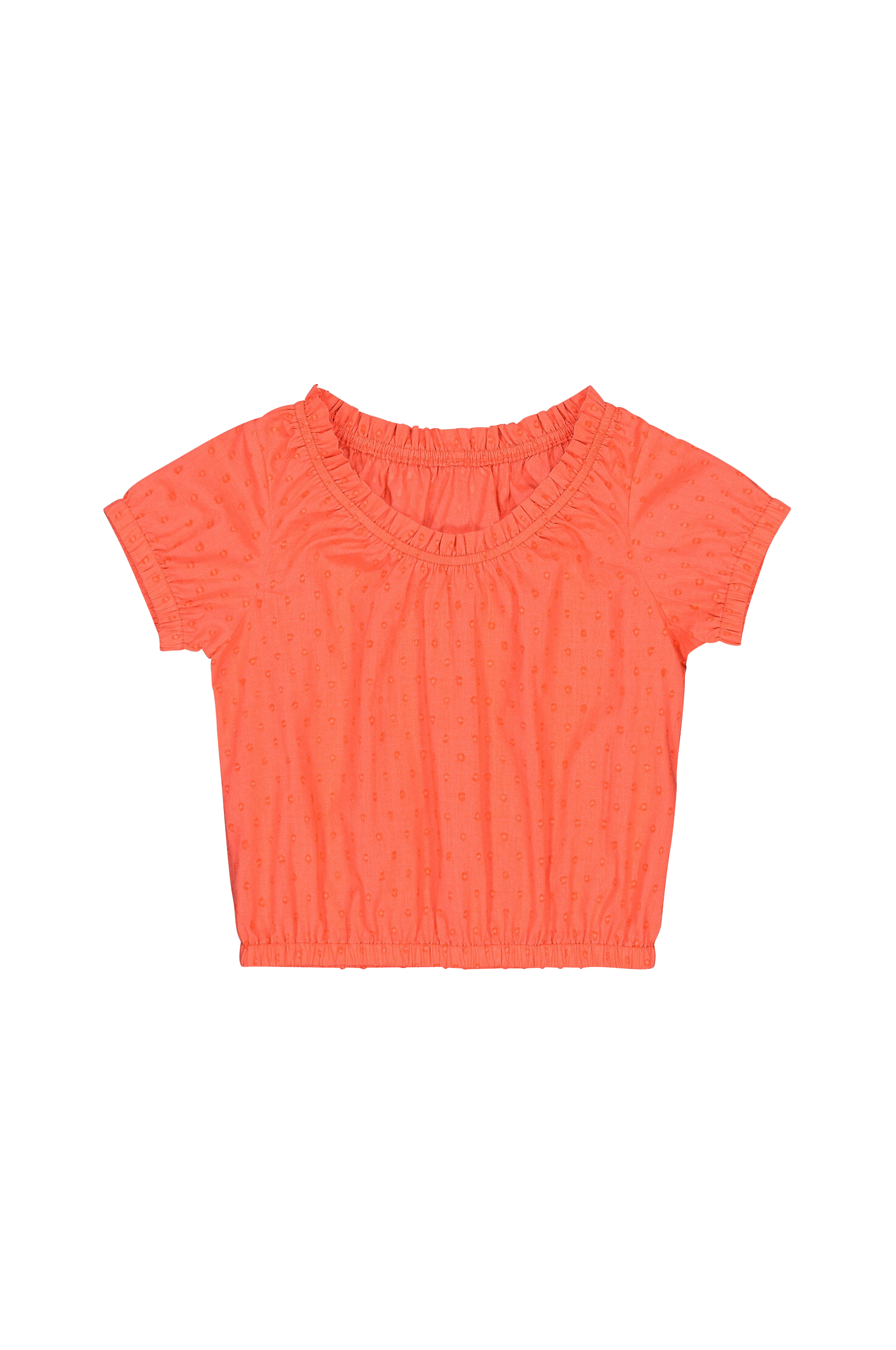 Detaljer - Kort model - Kort ærme - Lige model - Rund hals - Elastik i halsudskæring, ærmekanter og kant forneden - Prikket materiale Materiale og vaskeanvisning - 100% bomuld - Finvask 30° - Stryges ved middeltemperatur/tåler ikke blegemiddel - Tørretumbling ved lav temperatur - Tåler ikke kemisk rens