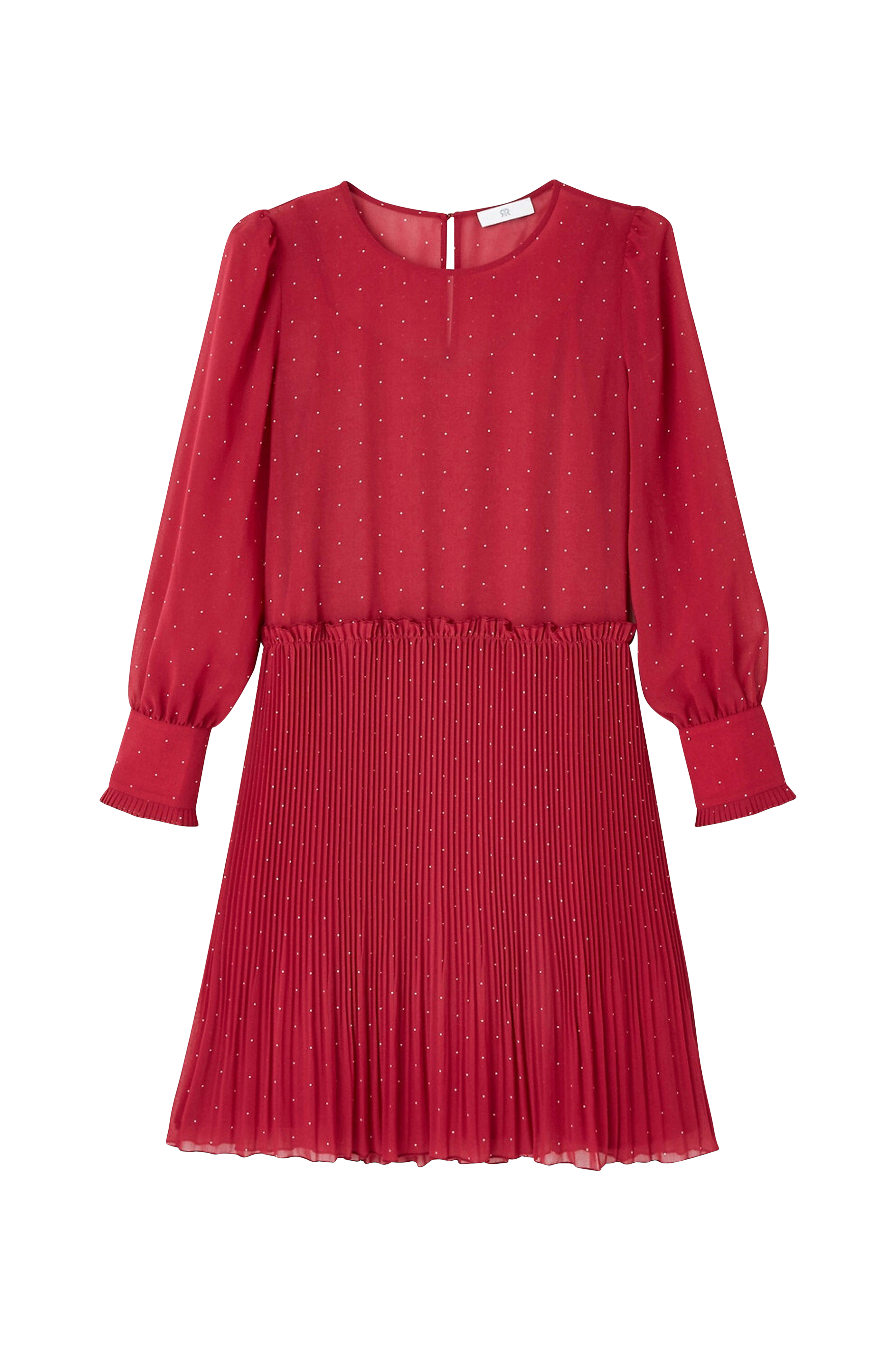Kort, prikket kjole i materiale med fint fald, med pufærme og lægget nederdel. Stilren og feminin model. Detaljer - Lige model - Kort model - Langt ærme - Rund hals - Prikket mønster Materiale og vaskeanvisning - Primært materiale: 100% polyester - For: 100% viskose - Finvask 30° - Stryges ved lav temperatur/tåler ikke blegemiddel - Tåler ikke tørretumbling - Tåler ikke kemisk rens Yderligere information