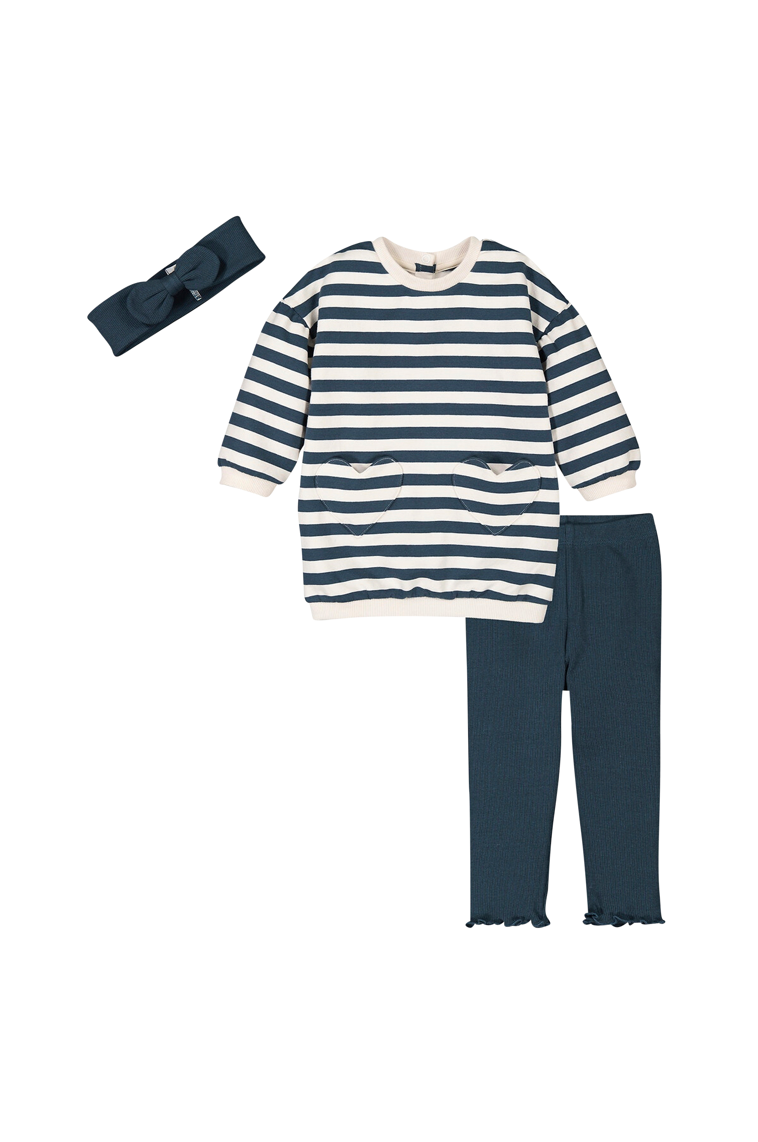 Sæt i tre dele med stribet sweatshirt, ensfarvede leggings og ribstrikket matchende hårbånd.