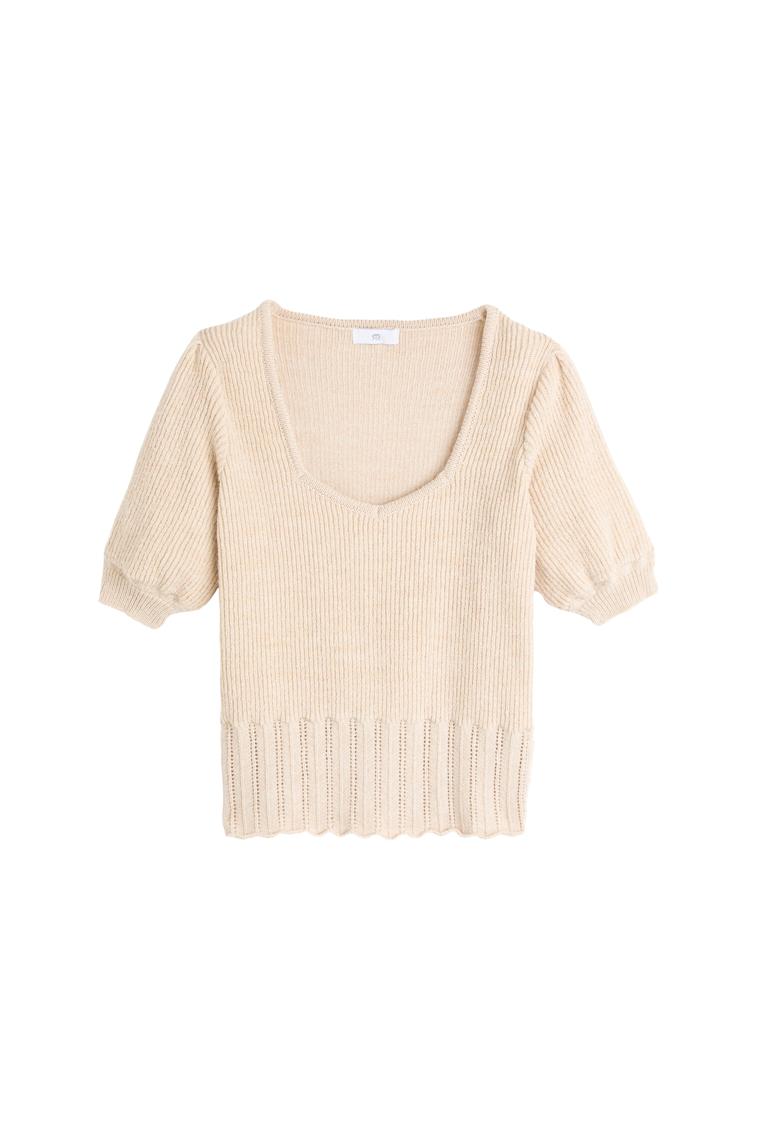 Blød striktrøje med flatterende V-udskæring i opdateret form. Trendy model med kort pufærme. Smukt hulmønster forneden.