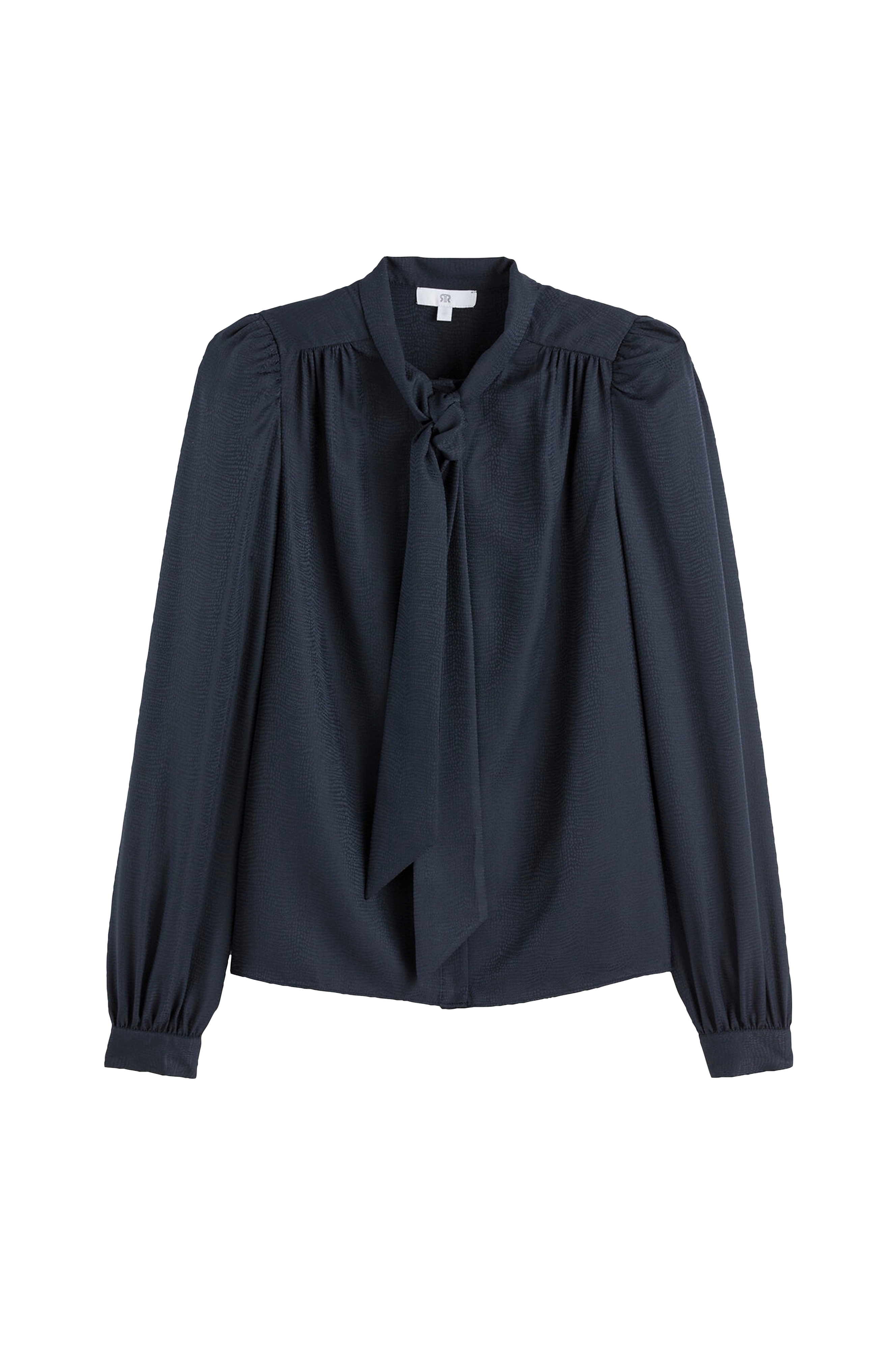 Trendy, 70'er-inspireret bluse med bindebånd i halsudskæringen. Elegant og stilfuld model. Detaljer