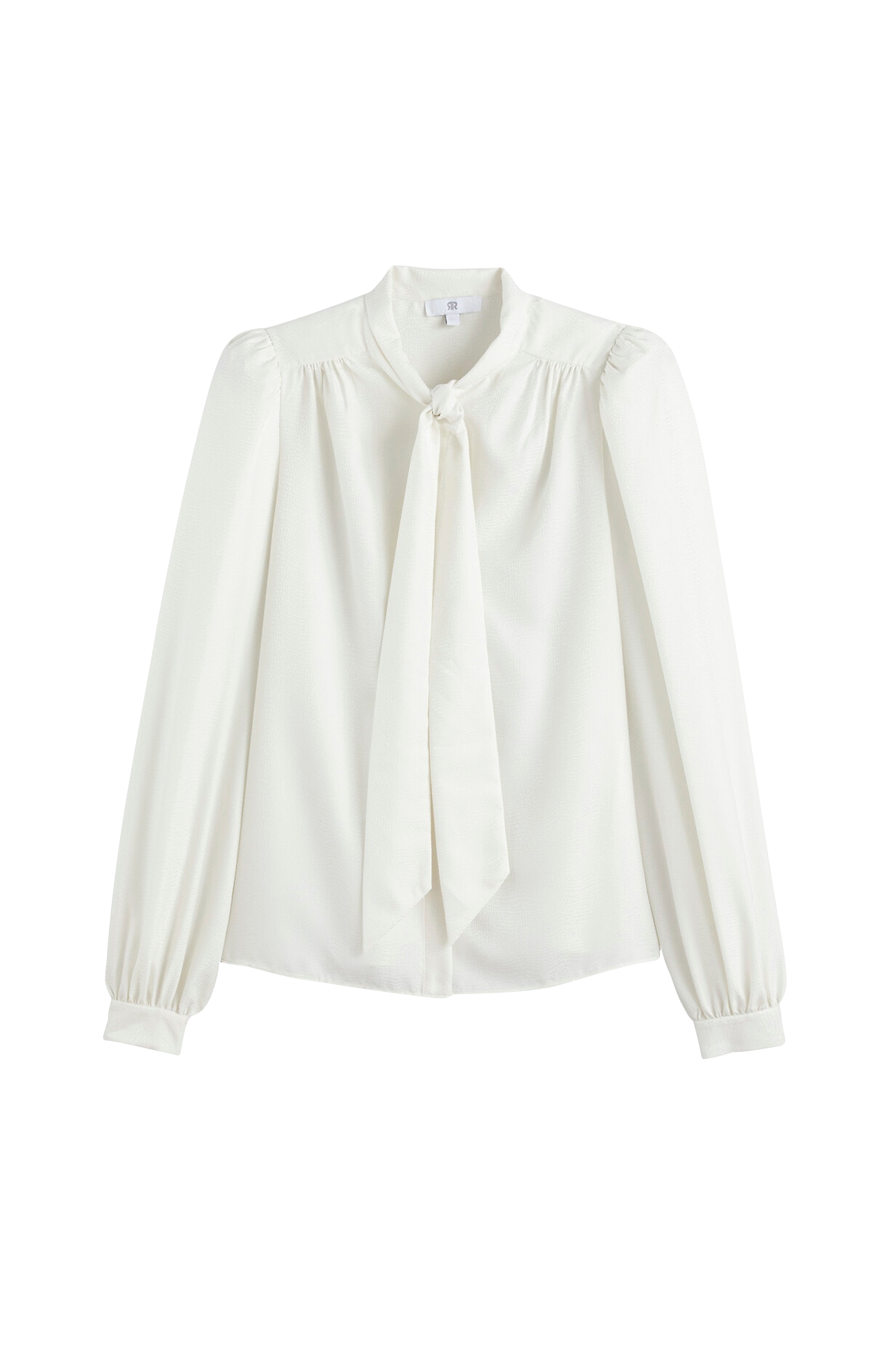 Trendy, 70'er-inspireret bluse med bindebånd i halsudskæringen. Elegant og stilfuld model. Detaljer