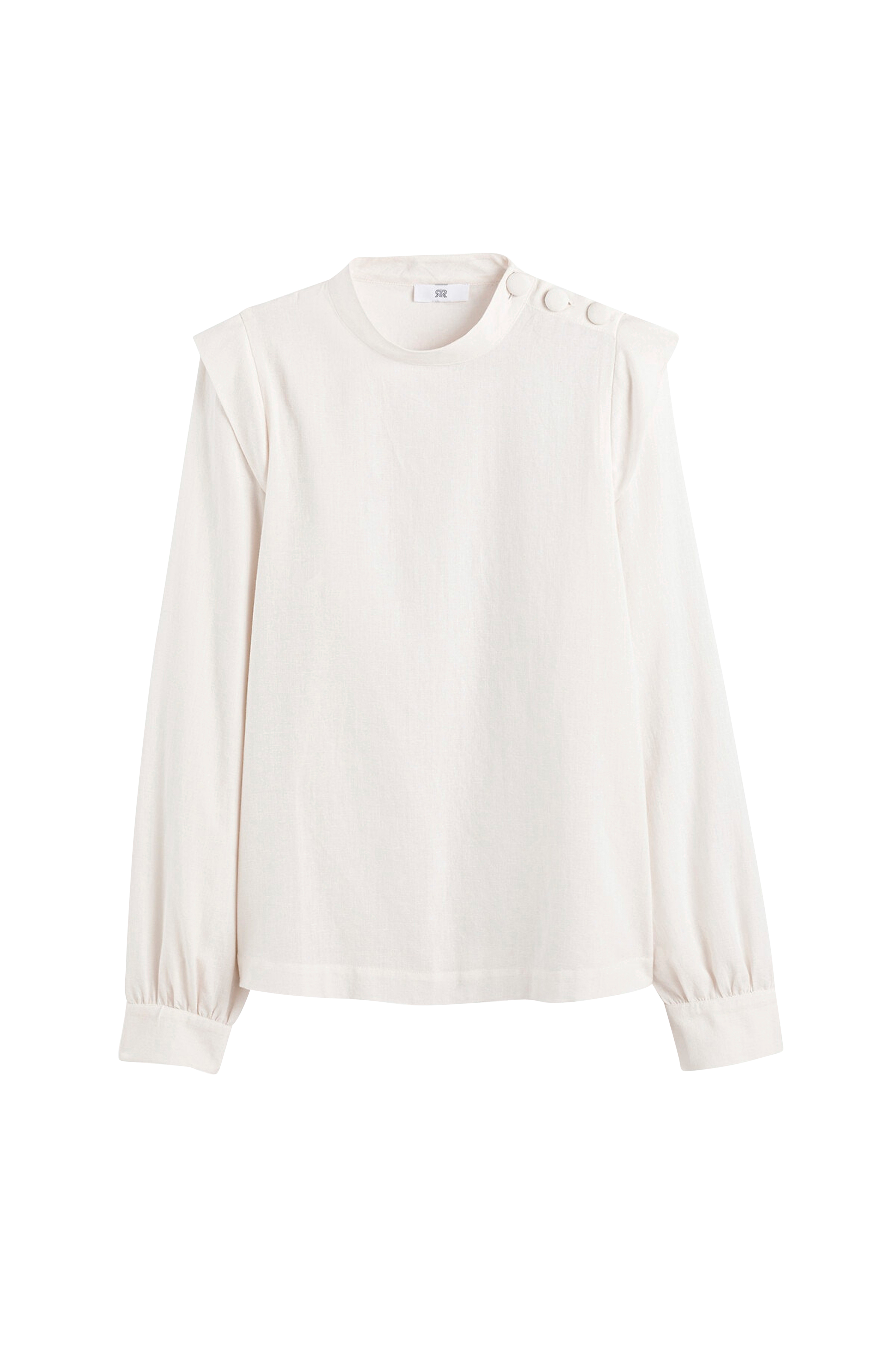Bluse, 80'er-inspireret med markerede skuldre. Smukt blandingsmateriale i bomuld/hør. Detaljer