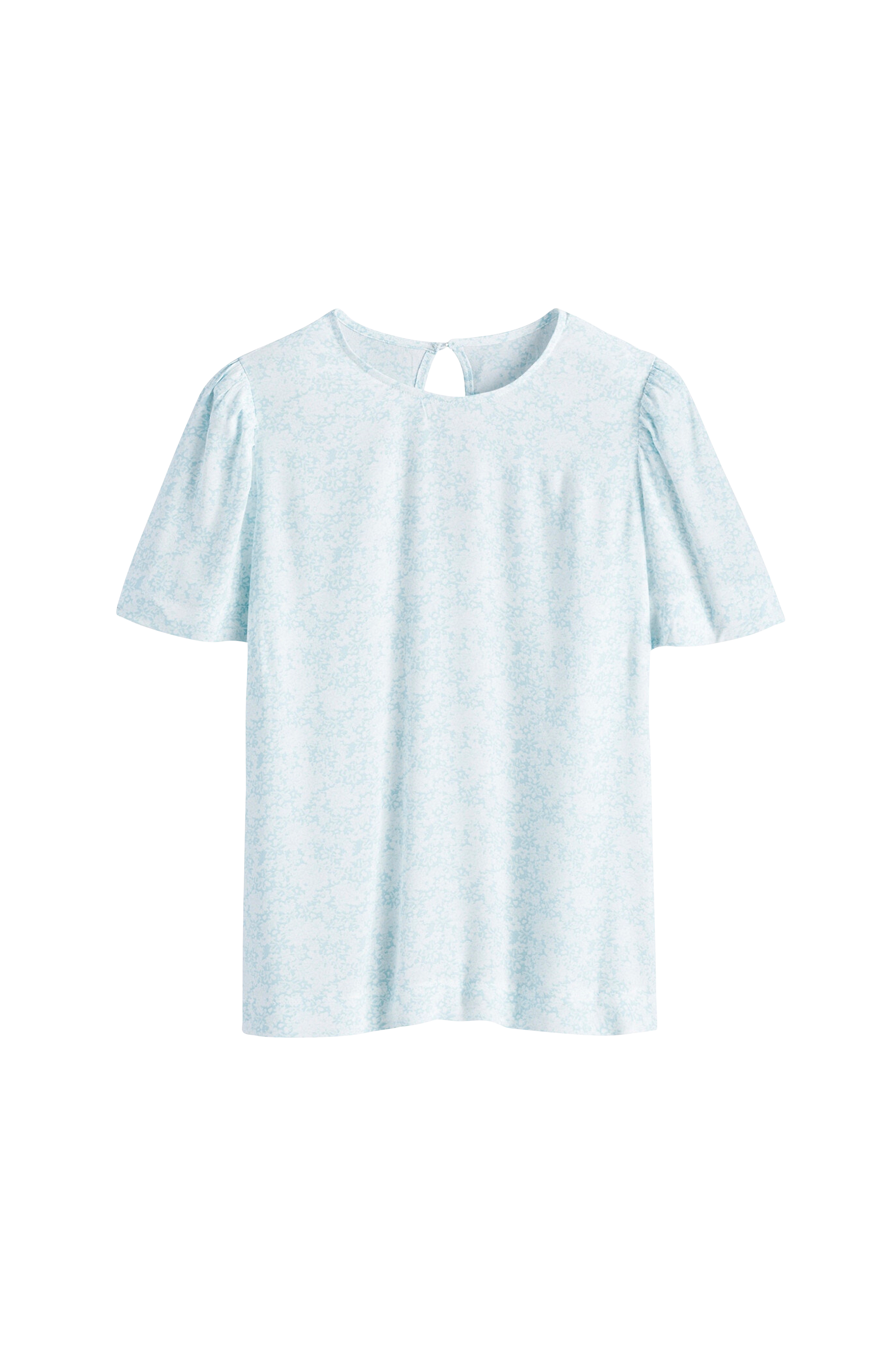 Blomstret bluse i blødt materiale, sommerfugleærme og små skulderpuder. Detaljer - Kort sommerfugleærme - Rund hals og dråbeformet slids med knap bagpå - Rynket ærmerunding - Små skulderpuder - Printet mønster Produktets mål i str. 38/M - Længde: 62 cm - Ærmelængde: 25 cm - Brystvidde: 100 cm