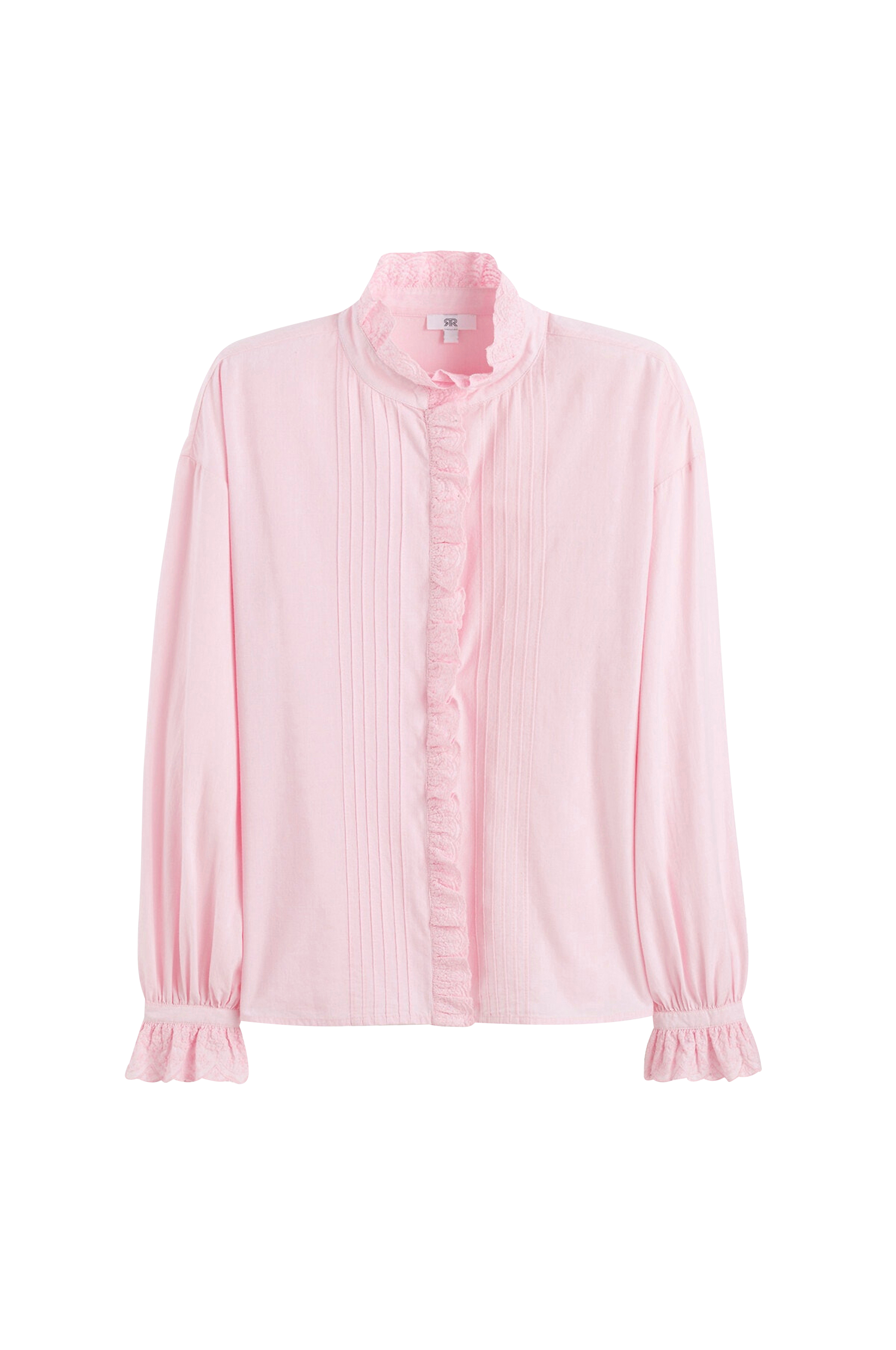 Romantisk bluse i victoriansk stil. Lille standkrave, broderede flæser og lagte læg foran. Trendy, feminin model. Detaljer