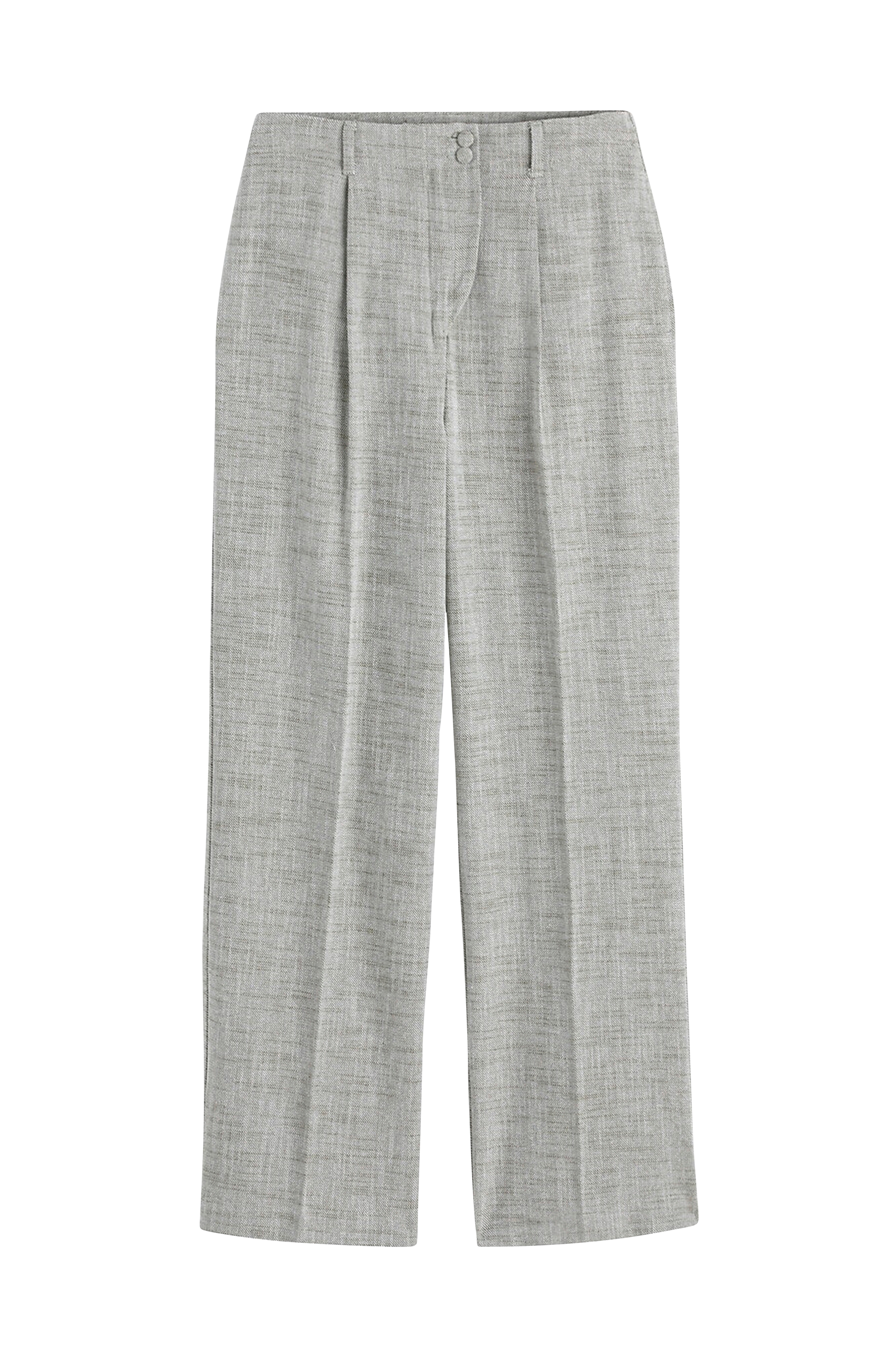 Elegante og behagelige bukser med læg og vide ben, i bomuldsmateriale med rustikt look. Linningen har en fin detalje med asymmetrisk lukning og betrukne knapper. Detaljer