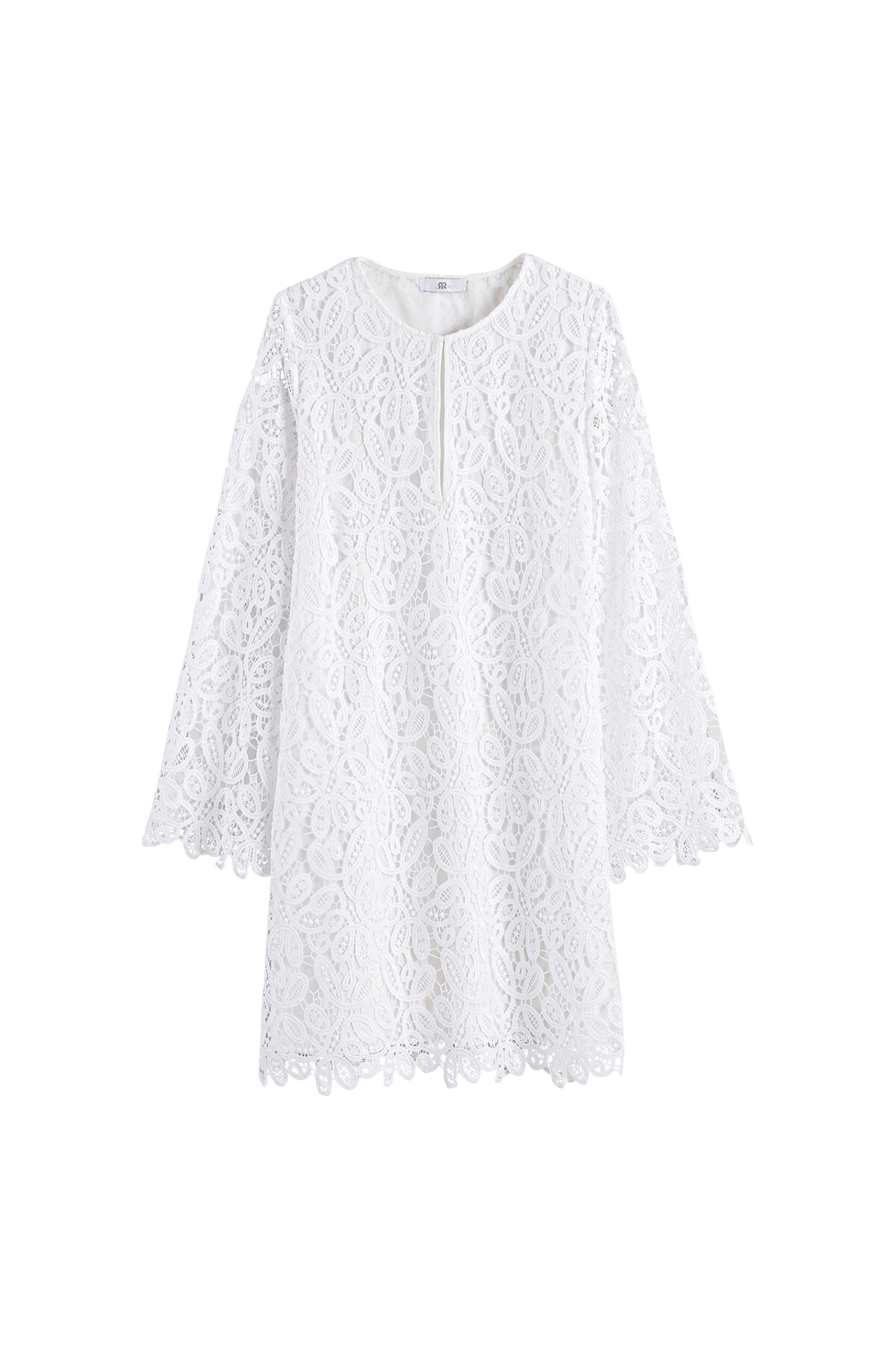 Feminin kjole med elegant broderi. A-formet model med stor bevægelsesfrihed. Langt ærme uden for med transparent effekt. Romantisk model i bohemestil. Detaljer