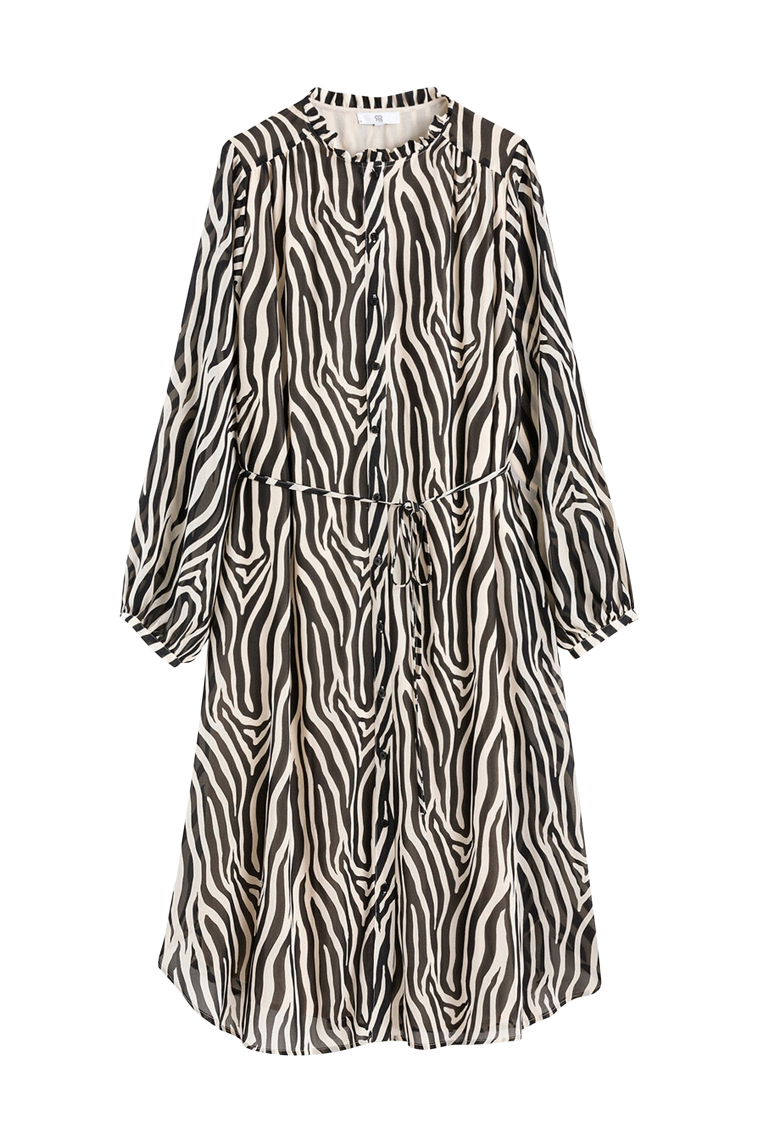 Lang kjole med dyremønster. Elegant og originalt mønster. Trendy model med pufærme og standkrave med flæse. Detaljer - A-formet model - Midilængde - Langt pufærme - Standkrave med flæse - Gennemknappet foran og bindebånd i taljen - Dyreprint Produktets mål i str. 38/M - Længde: 118 cm - Ærmelængde: 61 cm