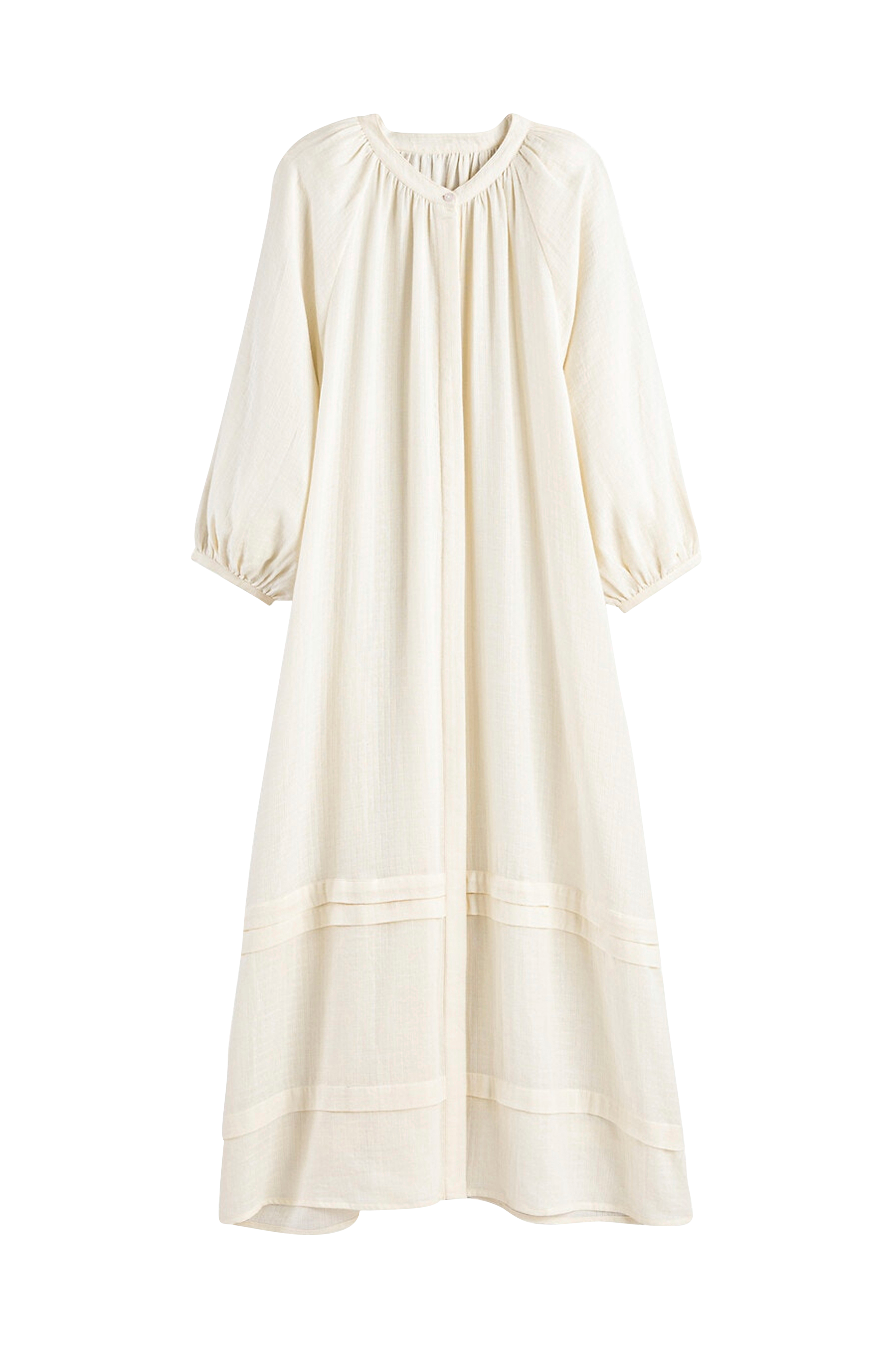 Lang kjole i bomuldsstof, et blødt og luftigt stof med en let vaffelstruktur, der er meget behagelig. A-formet model med stor bevægelsesfrihed. Flot bohemestil. Detaljer