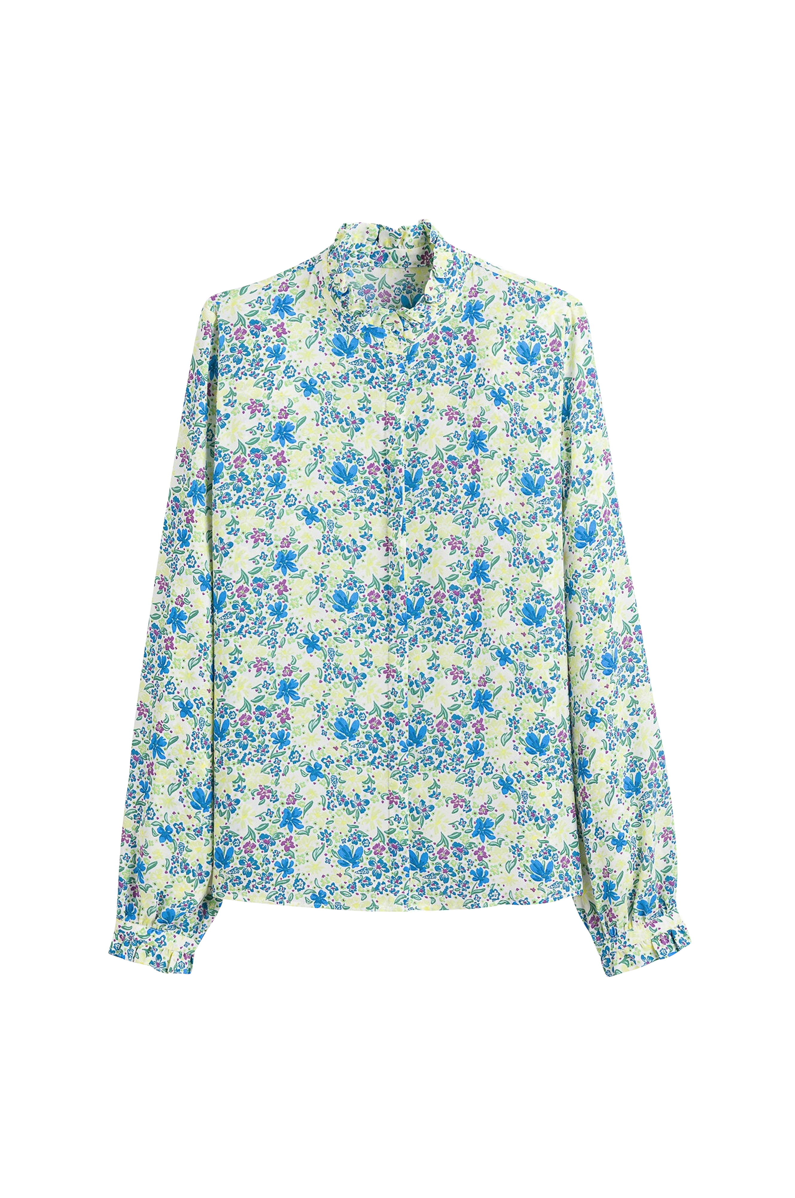 Romantisk og trendy model med blomstermønster og standkrave med flæse. Detaljer - Langt ærme med flæse i ærmekanten - Lige model - Standkrave med flæse - Skjult lukning - Blomstermønster Produktets mål i str. 38/M - Længde: 64 cm - Ærmelængde: 65 cm - Brystvidde: 104 cm