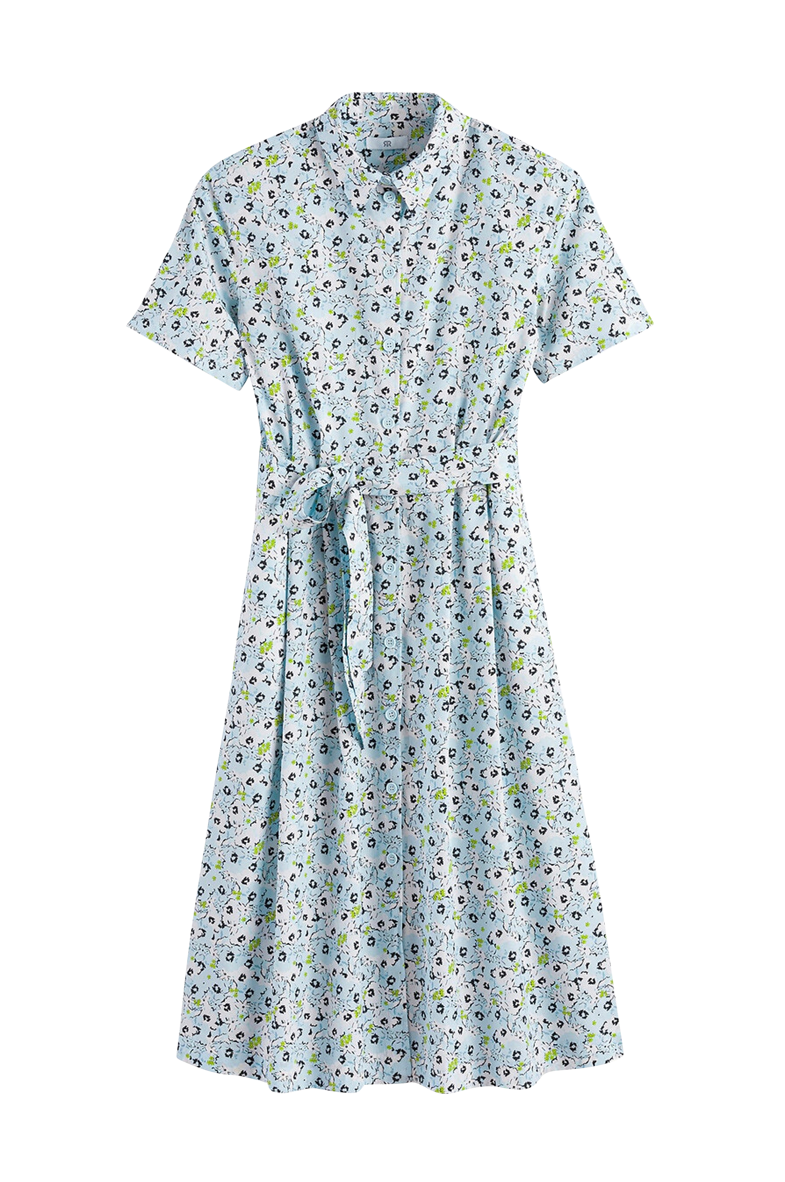 Skjortekjole med smukt blomstermønster. Tidløs model. Det matchende bindebælte markerer taljen. Detaljer