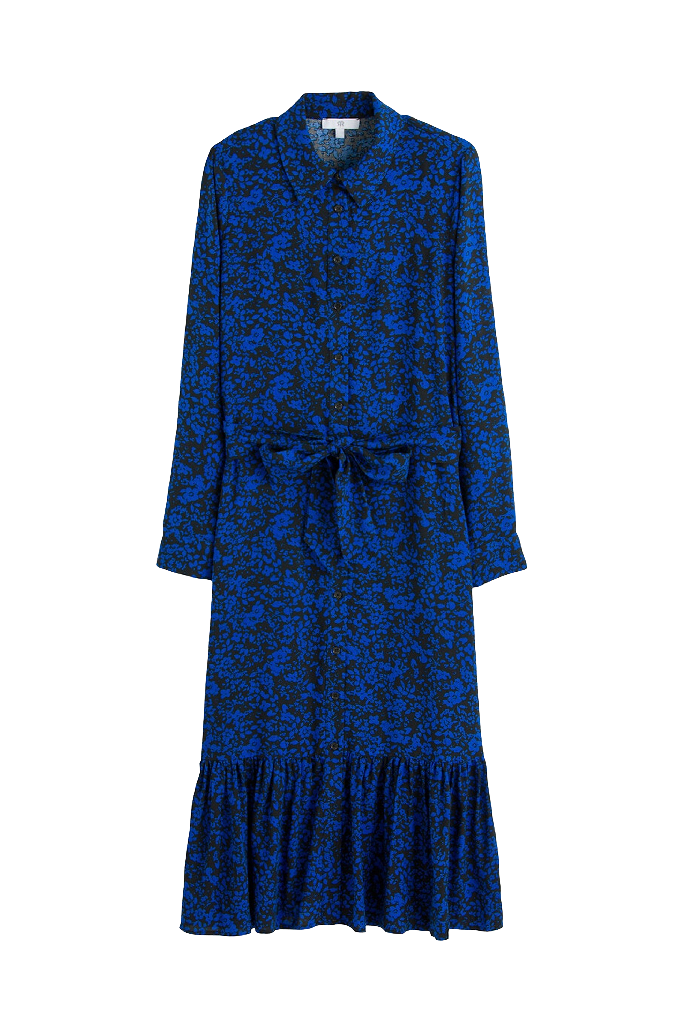 Lang skjortekjole i blødt materiale. Romantisk model med flæser. Detaljer - A-formet model - Midilængde - Langt ærme - Skjortekrave - Gennemknappet foran - Aftageligt bindebælte - Flæse forneden - Blomstermønster Produktets mål i str. 38/M - Længde: 122 cm - Ærmelængde: 61 cm