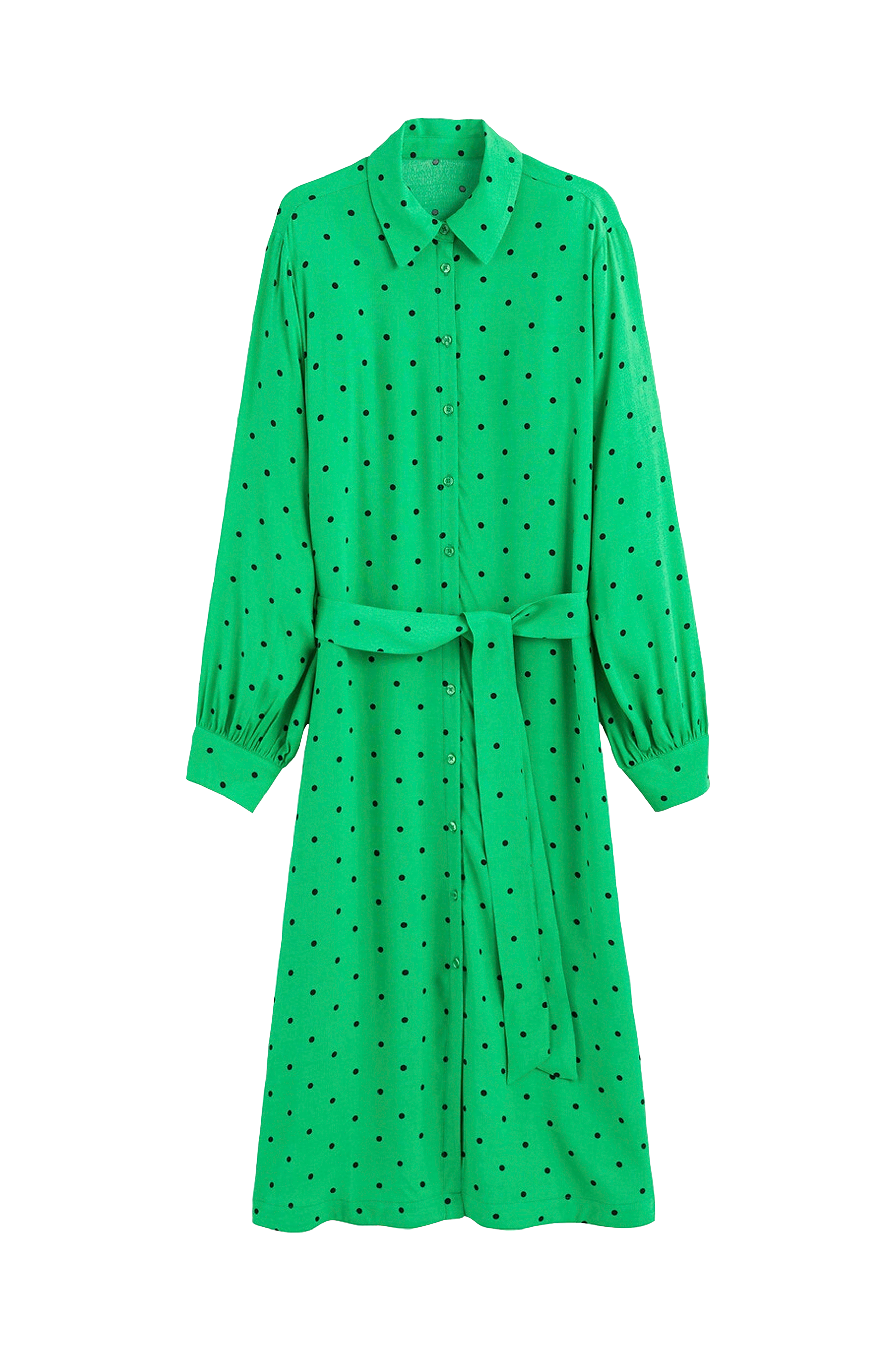 Farvestrålende skjortekjole med prikker. Tidløst snit. Trendy pufærme. Den perfekte basis-style i din garderobe. Detaljer - A-formet model - Midilængde - Langt pufærme - Skjortekrave - Gennemknappet foran - Bindebælte i taljen - Prikket mønster Produktets mål i str. 38/M - Længde: 120 cm - Ærmelængde: 61 cm