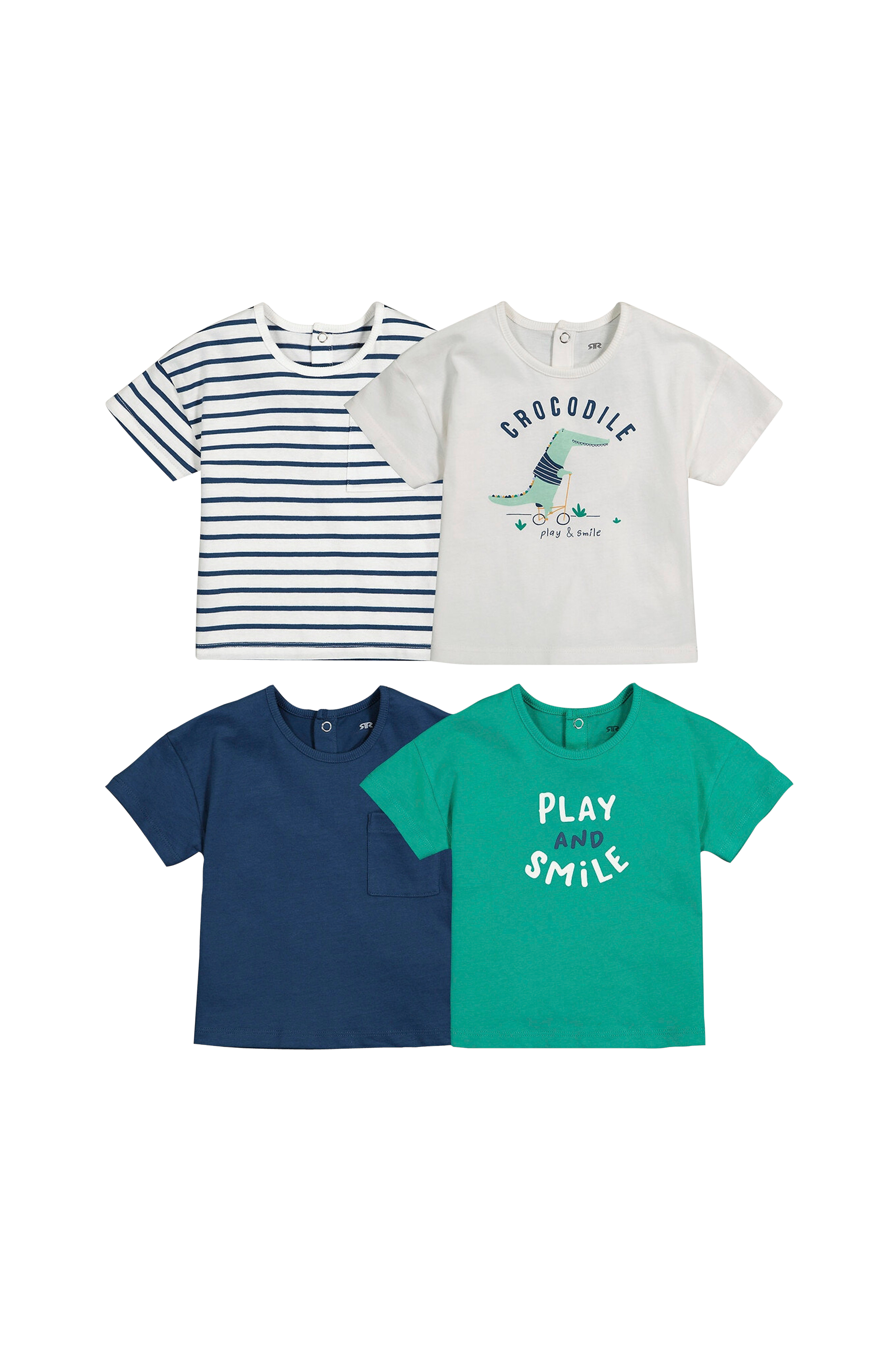 - 1 med krokodillemotiv foran + 1 ensfarvet med tekstmotiv Play and Smile foran + 1 stribet med brystlomme + 1 ensfarvet med brystlomme
