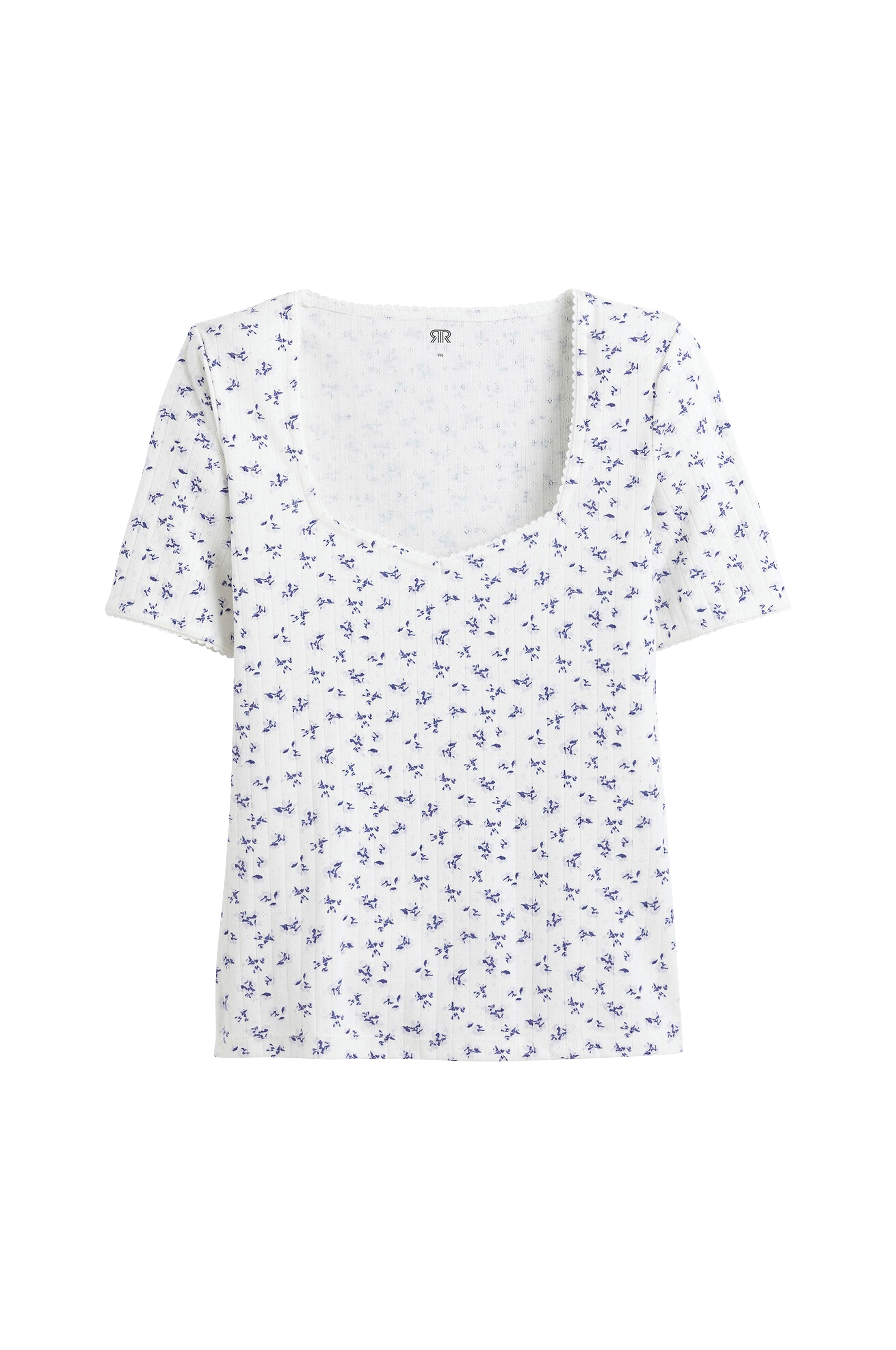 Top med småblomstret mønster. Flatterende kantet halsudskæring. Romantisk, sommerlig model. Detaljer