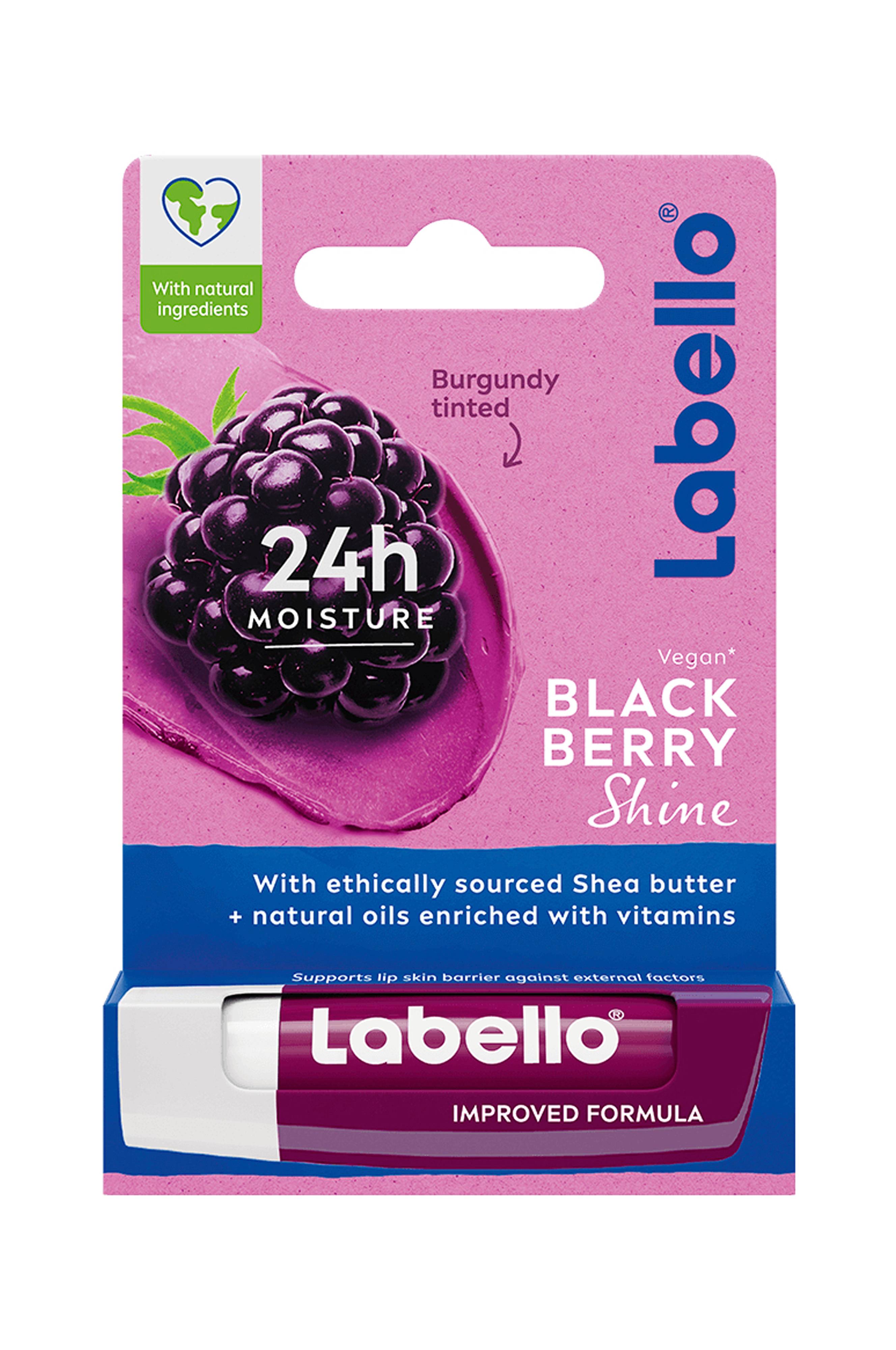 Labello Blackberry Shine Lip Balm fugter dine læber og giver dem en skøn bordeauxglans. Det bedste fra to verdener, pleje og farve. Den unikke formel beriget med skinnende pigment trænger øjeblikkeligt ind i dine læber og holder dem fugtede i 24 timer. Formlen indeholder kun naturlige olier, ingen mineralolier.