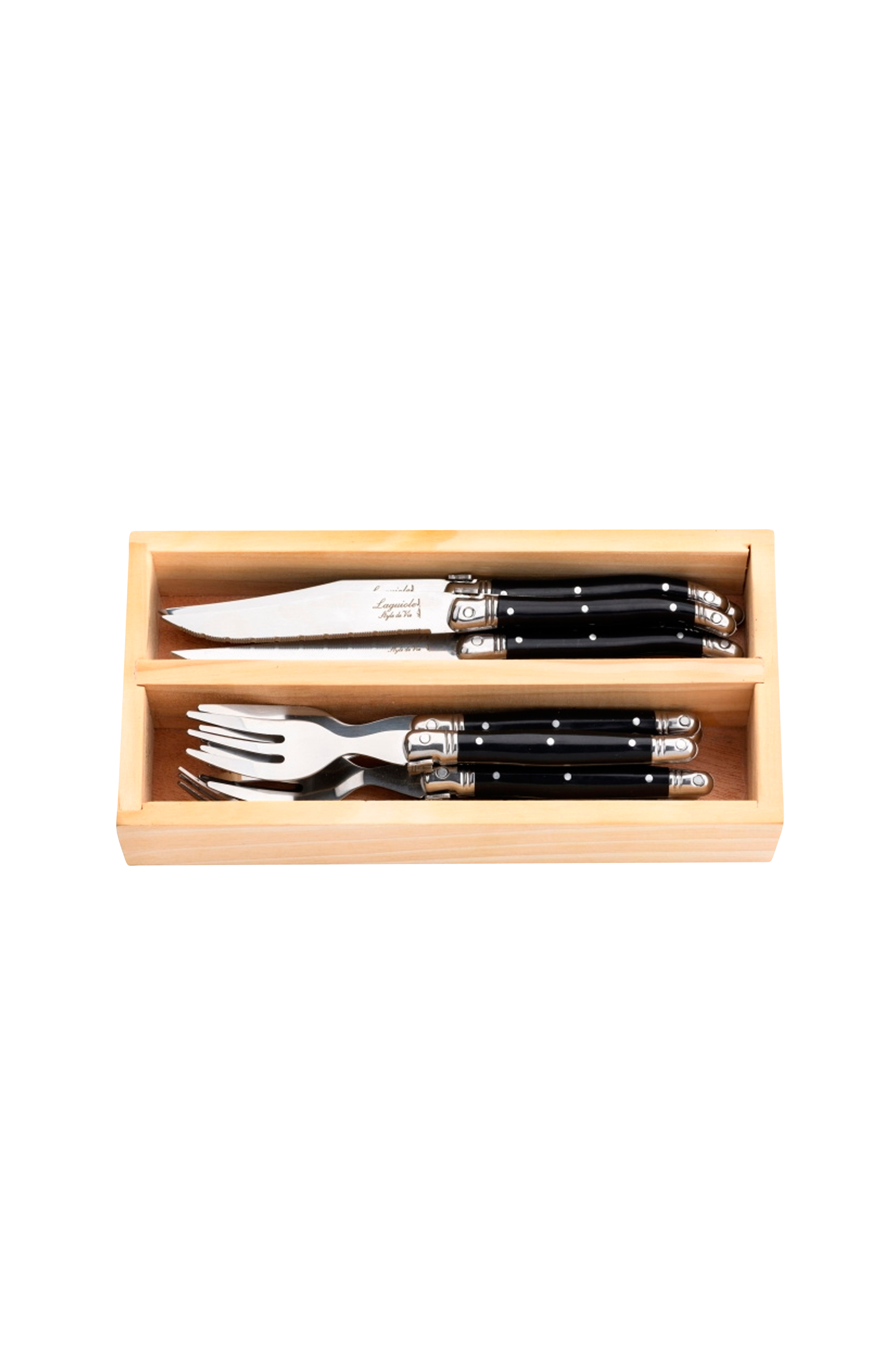 Med miniserviset i 12 dele fra premiumserien Laguiole Style De Vie kan du nemt få dine gæster til at smile. De er meget velegnede til en tapasaften, picnic, sommergrill eller et fyldt cocktailparty. Minibestikket kommer i et sæt til 6 personer og er pakket i en bestikbakke af træ. Ideelt til at tage med udenfor. Tykkelsen på bladet er 1,2 mm, og både knive og gafler tåler opvaskemaskine. Gør dit Laguiole Style De Vie minisæt komplet med de matchende miniskeer, pinchos, kagegafler og appetizerskeer.