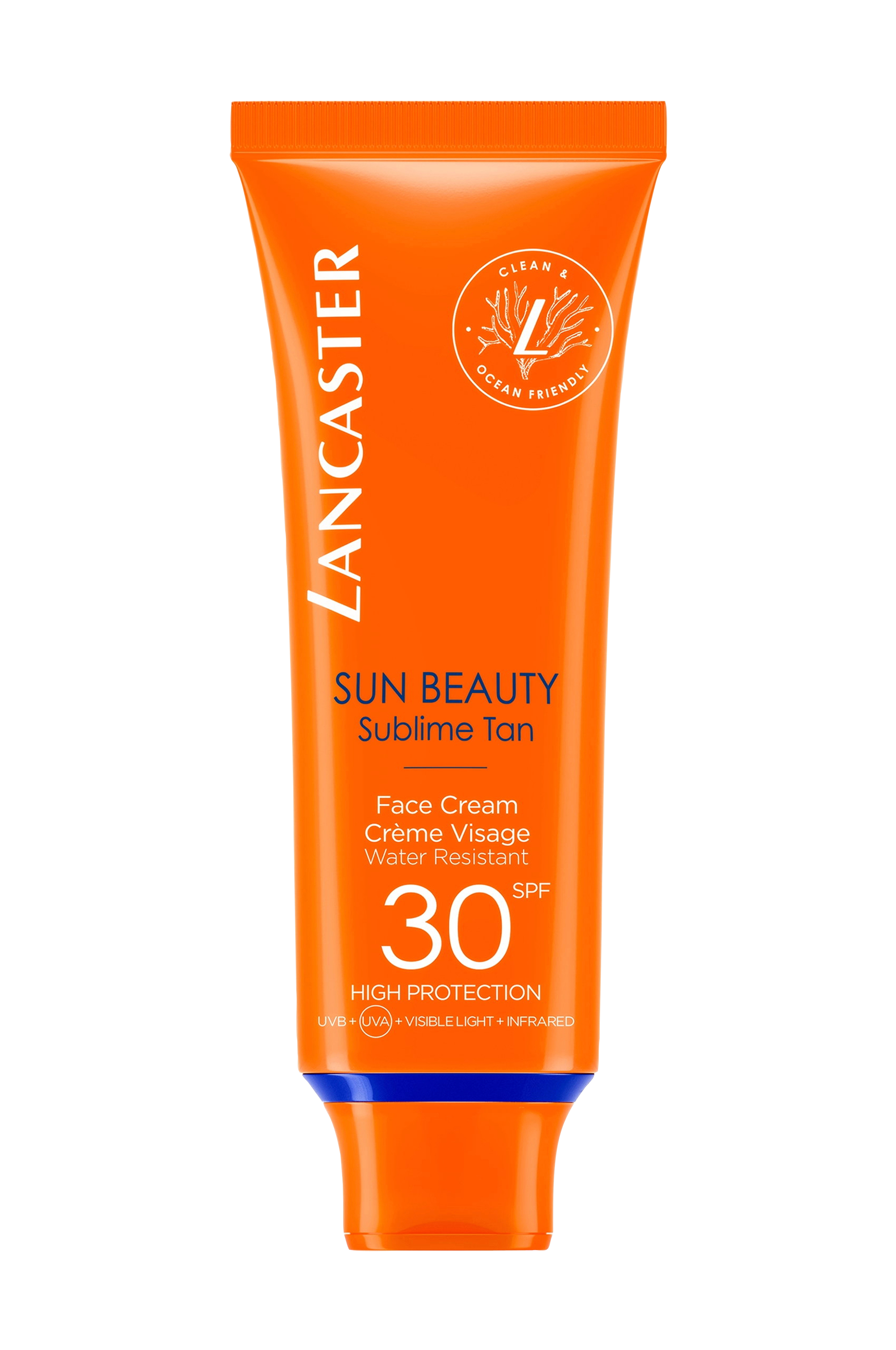 Lancasters mest avancerede solbeskyttelse findes i Sun Beauty Face Cream SPF30. Udover at fange 100% af solens spektrum*, hjælper dette rene, havvenlige og sensuelle solbeskyttelsesprodukt også med at reparere solskader på huden. Vores unikke formel, der er ultralet, ikke-fedtet og umiddelbart usynlig på huden, giver en frisk, gylden solbrun hud på to gange kortere soleksponeringstid.** Ansigtscremen blender ind i huden uden at efterlade hvide spor og tørrer ud til en perfekt, fløjlsagtig finish, der fremhæver hudens skønhed og giver den varig fugt.