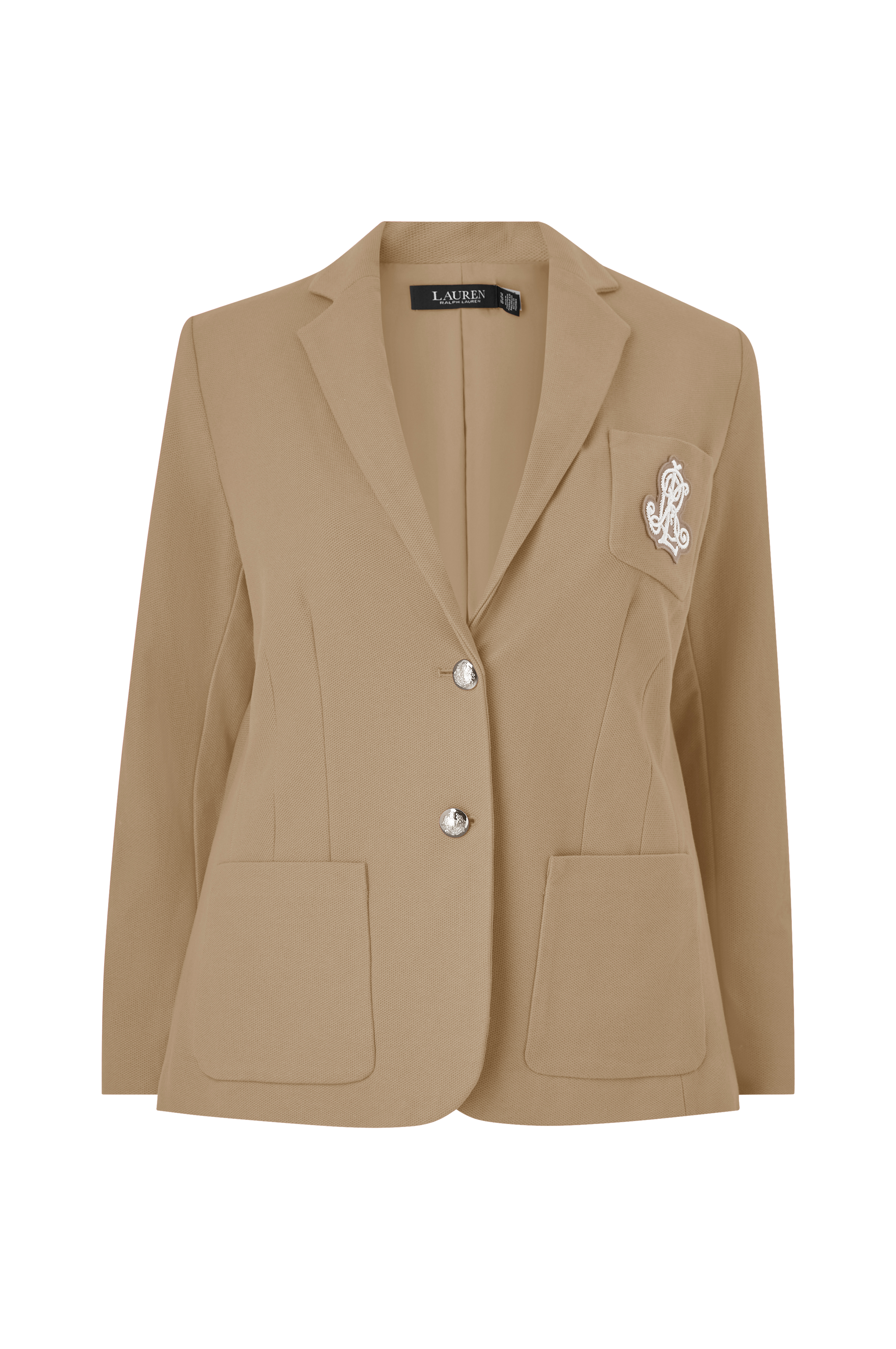 Foret blazer i piquémateriale med let vatterede skuldre. Brystlomme med stort sølvfarvet broderi. To påsyede lommer. Knapper i sølvfarvet metal med præget logo. Fire metalknapper i ærmekant.Plusstørrelser.Længde ca. 70 cm i str. 2XL.