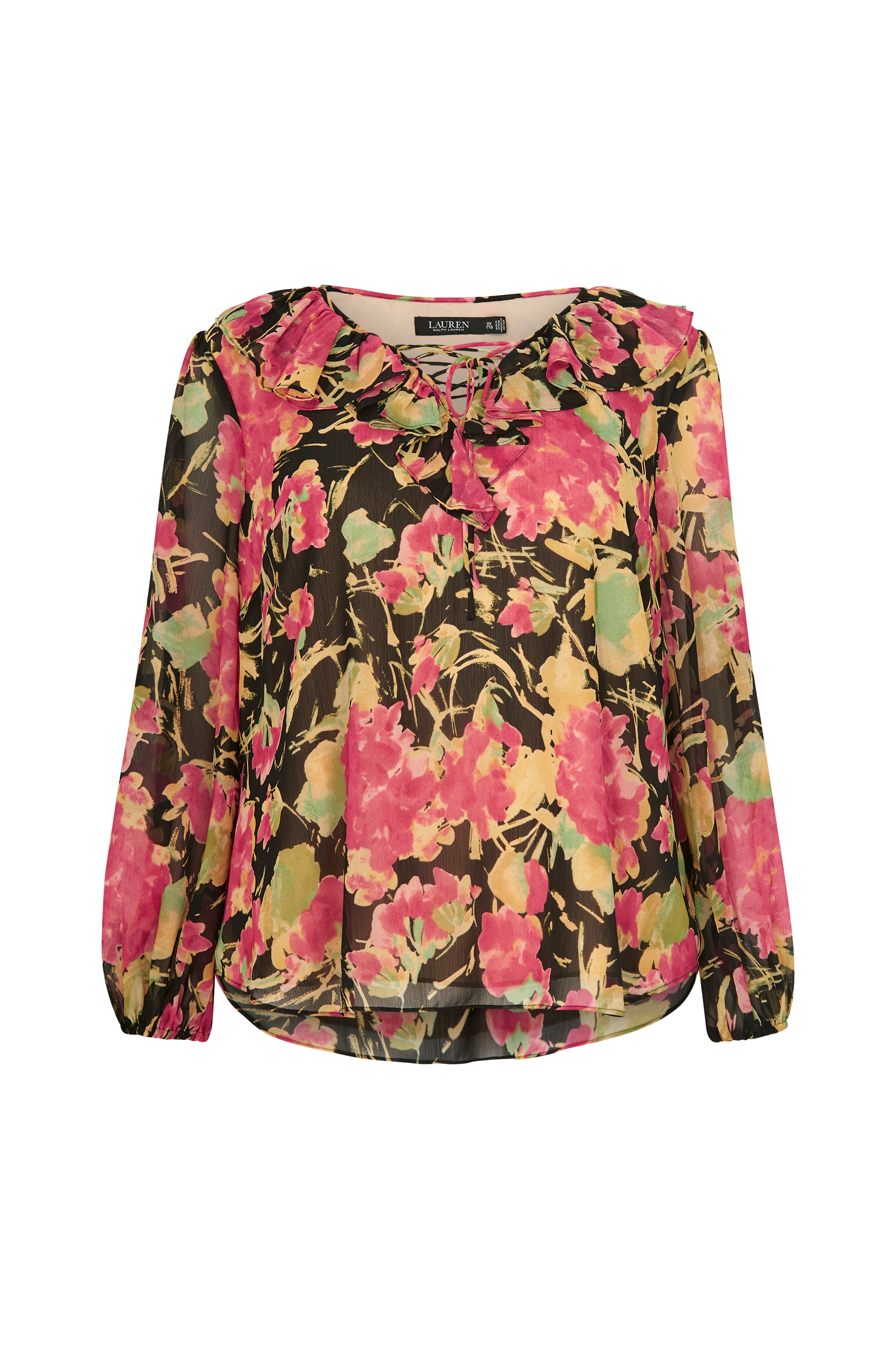• Store størrelser • Bluse i chiffon • V-udskæring med volant og bindebånd foran • Ballonærmer med elastiske manchetter • Foret • Produktet indeholder genindvundet materiale, som genbruges for at reducere mængden af affald samtidigt med at der ikke anvendes nye ressourcer.