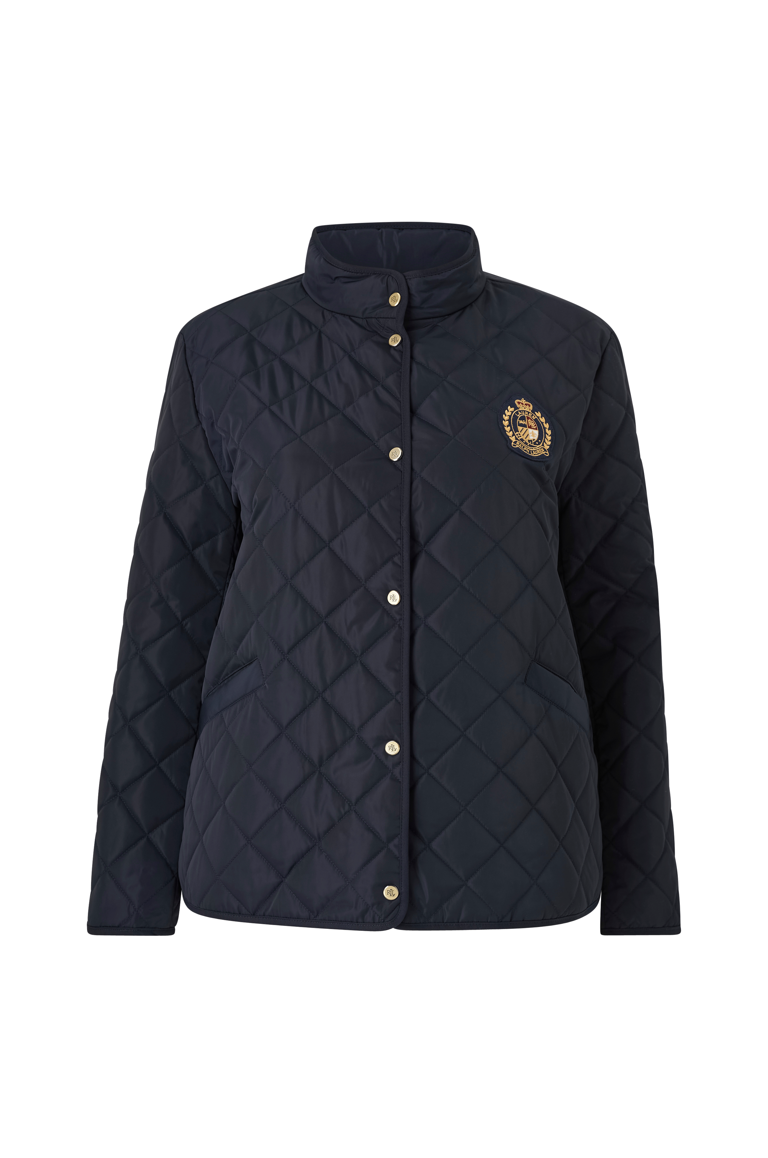 • Quiltet, let foret jakke • Høj krave • Trykknapslukning • Påsyet, broderet badge på brystet • To lommer • Store størrelser • Længde: 68 cm i størrelse 46/48