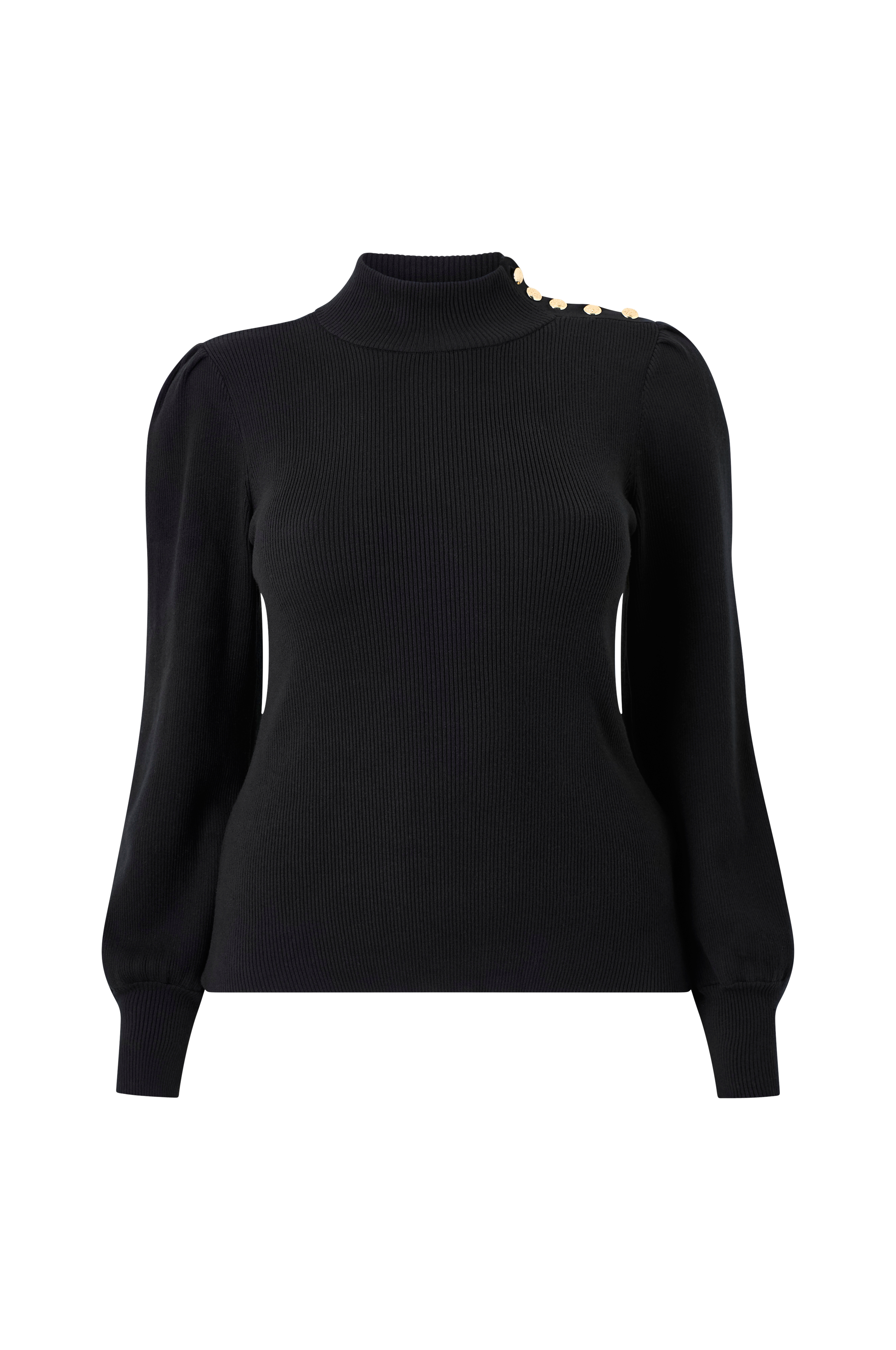 • Ribstrikket trøje med krave• Lange pufærmer med ribmanchetter ved manchetterne• Dekorative, guldfarvede knapper på en skulder og på manchetterne• Plusstørrelser