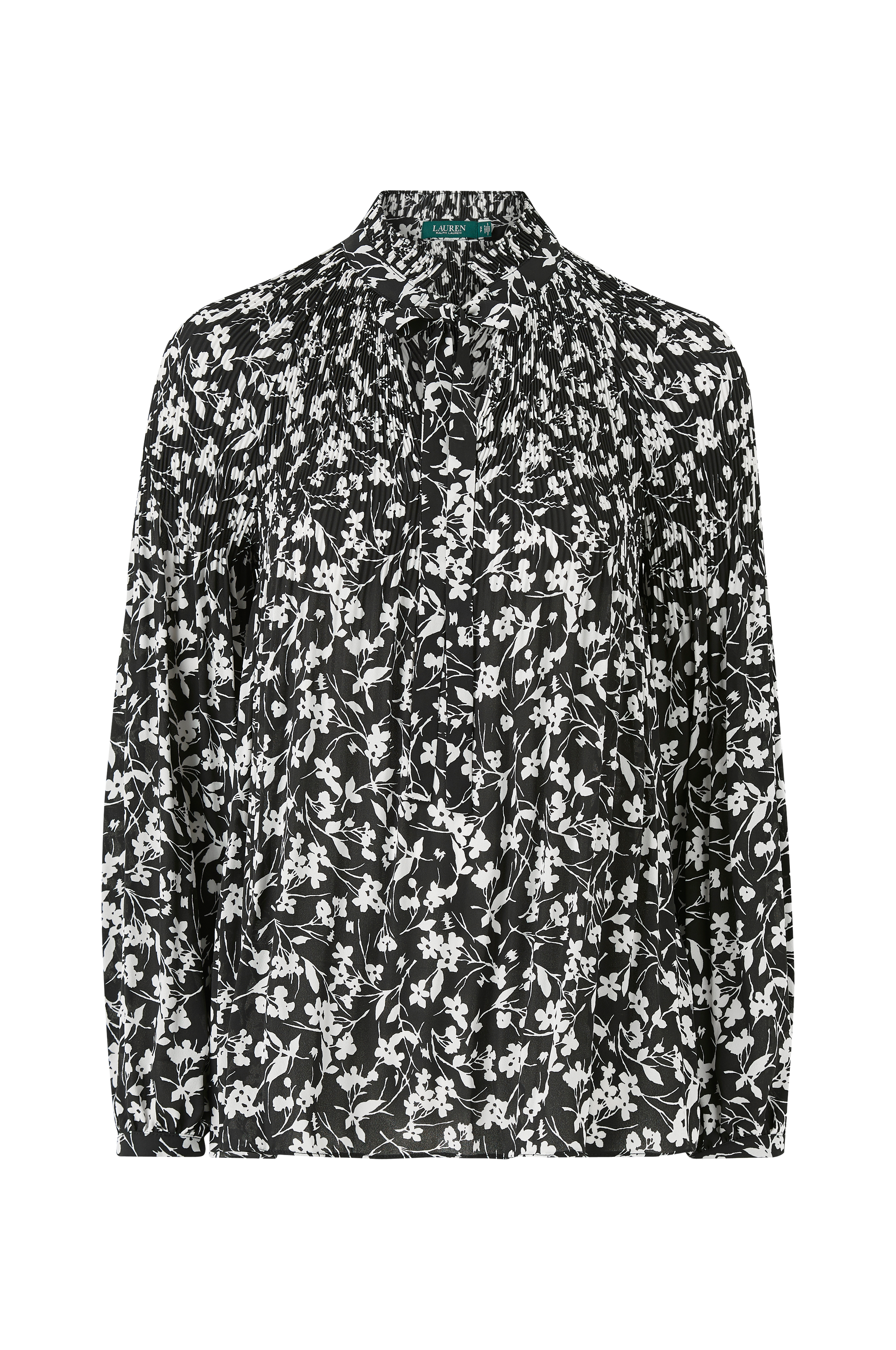 Bluse Duong Long Sleeve Shirt fra Lauren Ralph Lauren i tynd, vævet kvalitet med effektfuld plissering med smallere læg foroven. V-udskæring med bindebånd og lange ærmer med manchet og guldfarvet knap.
