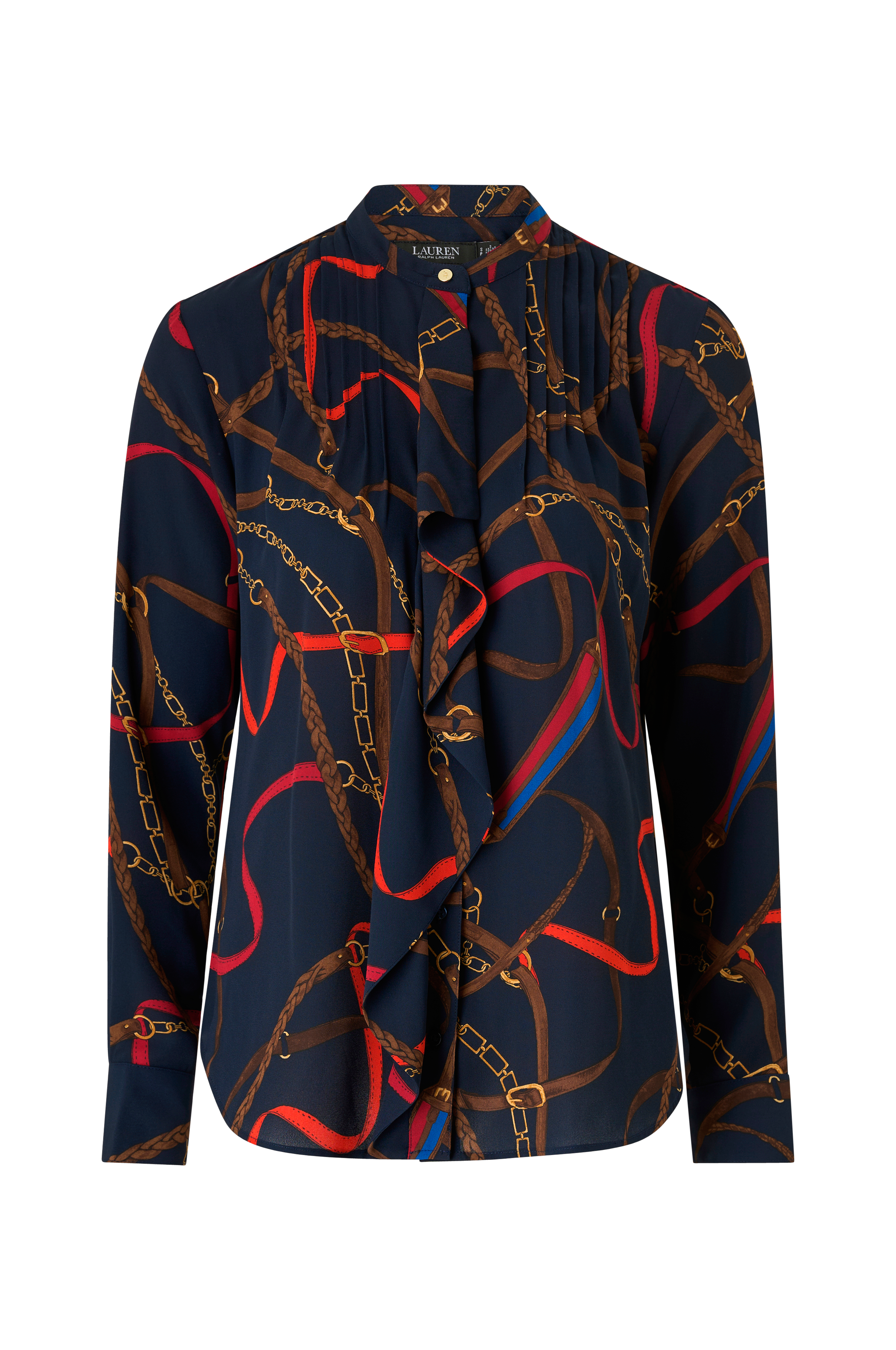 • Langærmet, mønstret bluse i chiffon• Rund halsudskæring• Syede lægge oppe foran• Knapper hele vejen frem med draperet volantdetalje ovenpå• Afrundet søm• Manchetter ved manchetterne