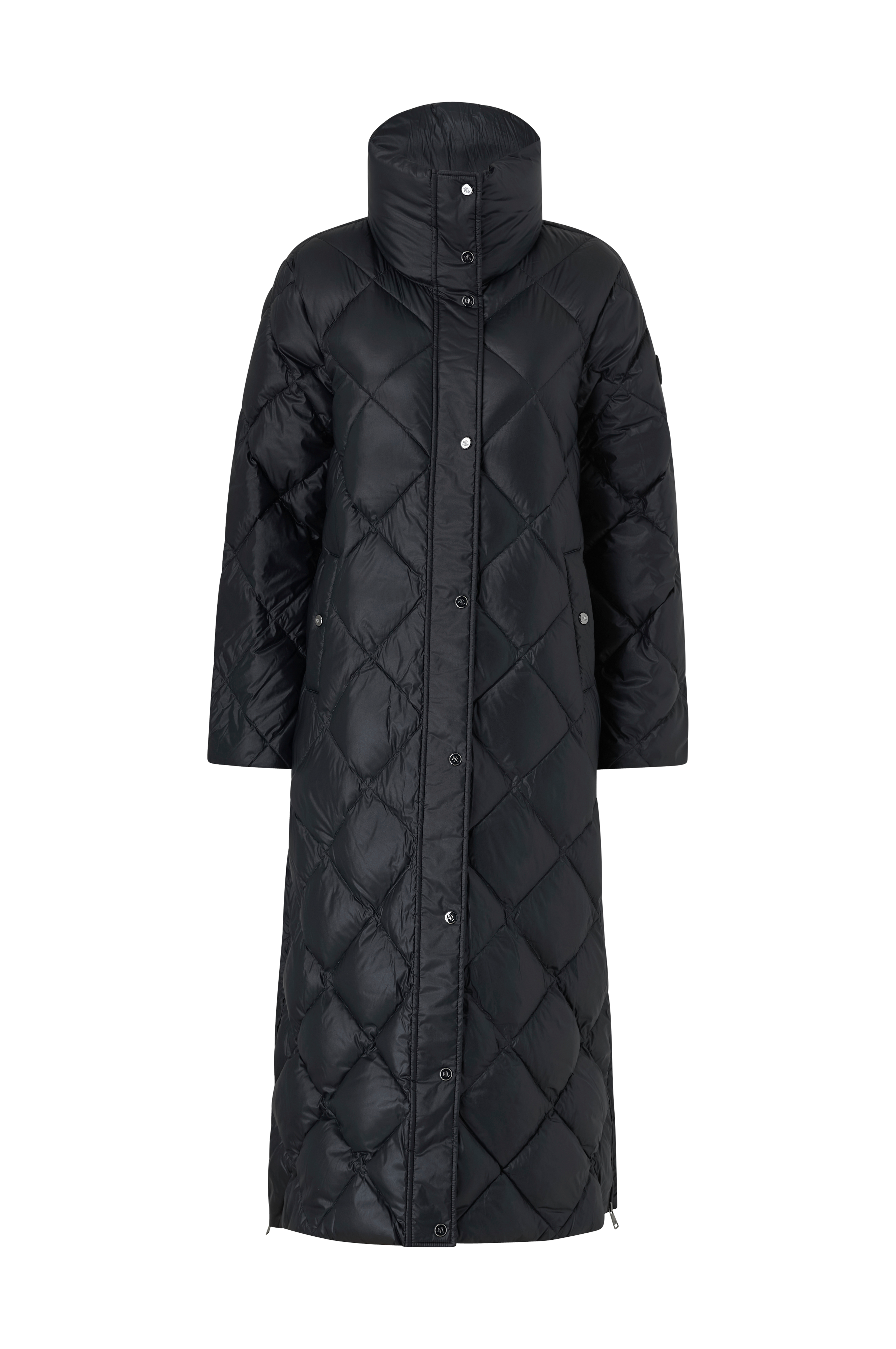 • Lang, varm dunfrakke med skinnende ydermateriale• Høj, foret krave• Lynlås• Vindflap over lynlåsen med trykknapper• To lommer med trykknapslukning• Lynlåse nede i siderne• Længde: 124 cm i størrelse S