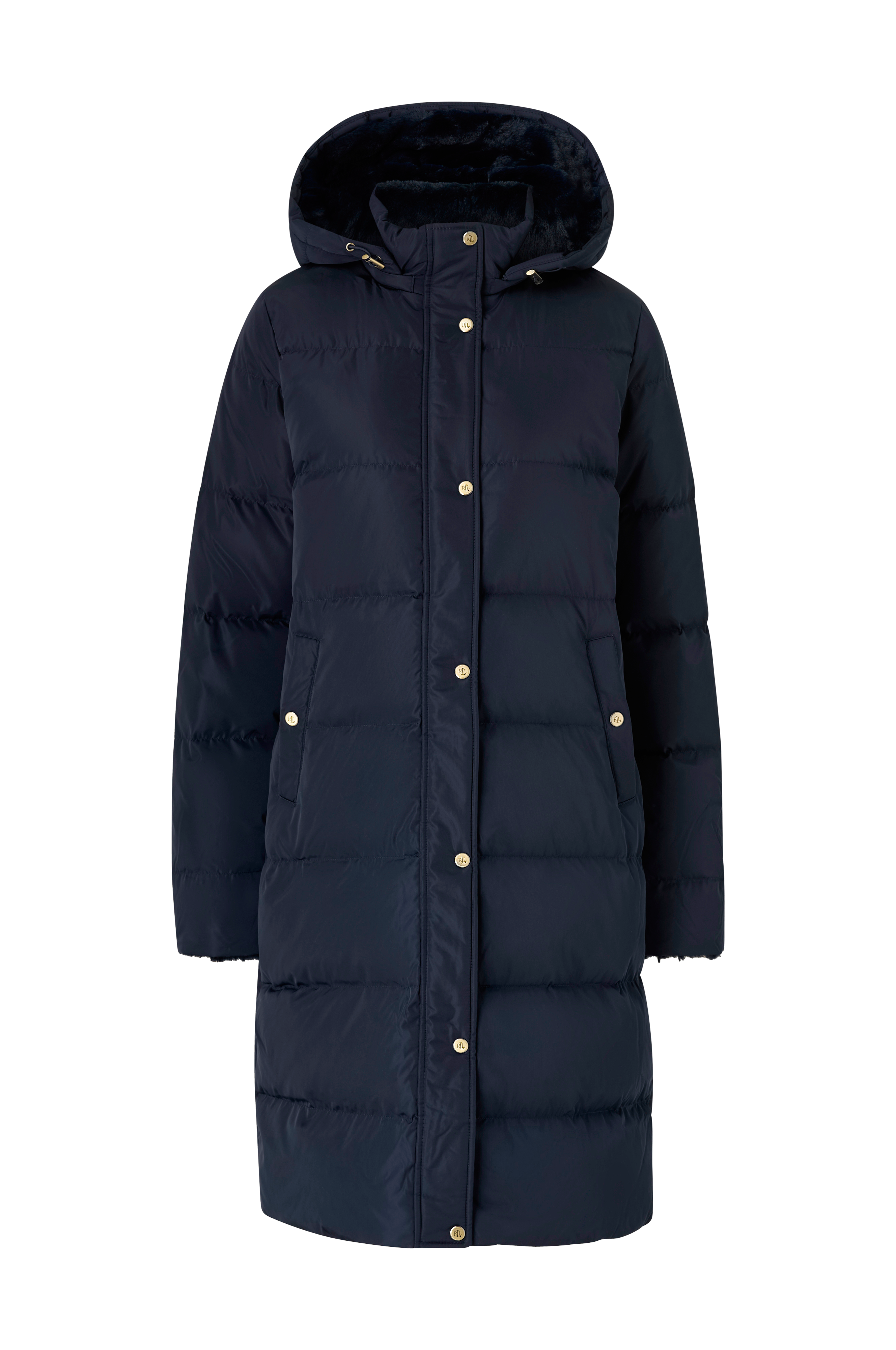 • Foret frakke med fyld i dun og fjer• Justérbar, aftagelig hætte• Lynlåslukning• Vindflap over lynlåsen• Tekstilforing• Kunstig pels på indersiden af kraven, i hætten og ved ærmeafslutningerne• Forede sidelommer• Længde: 102 cm i størrelse S