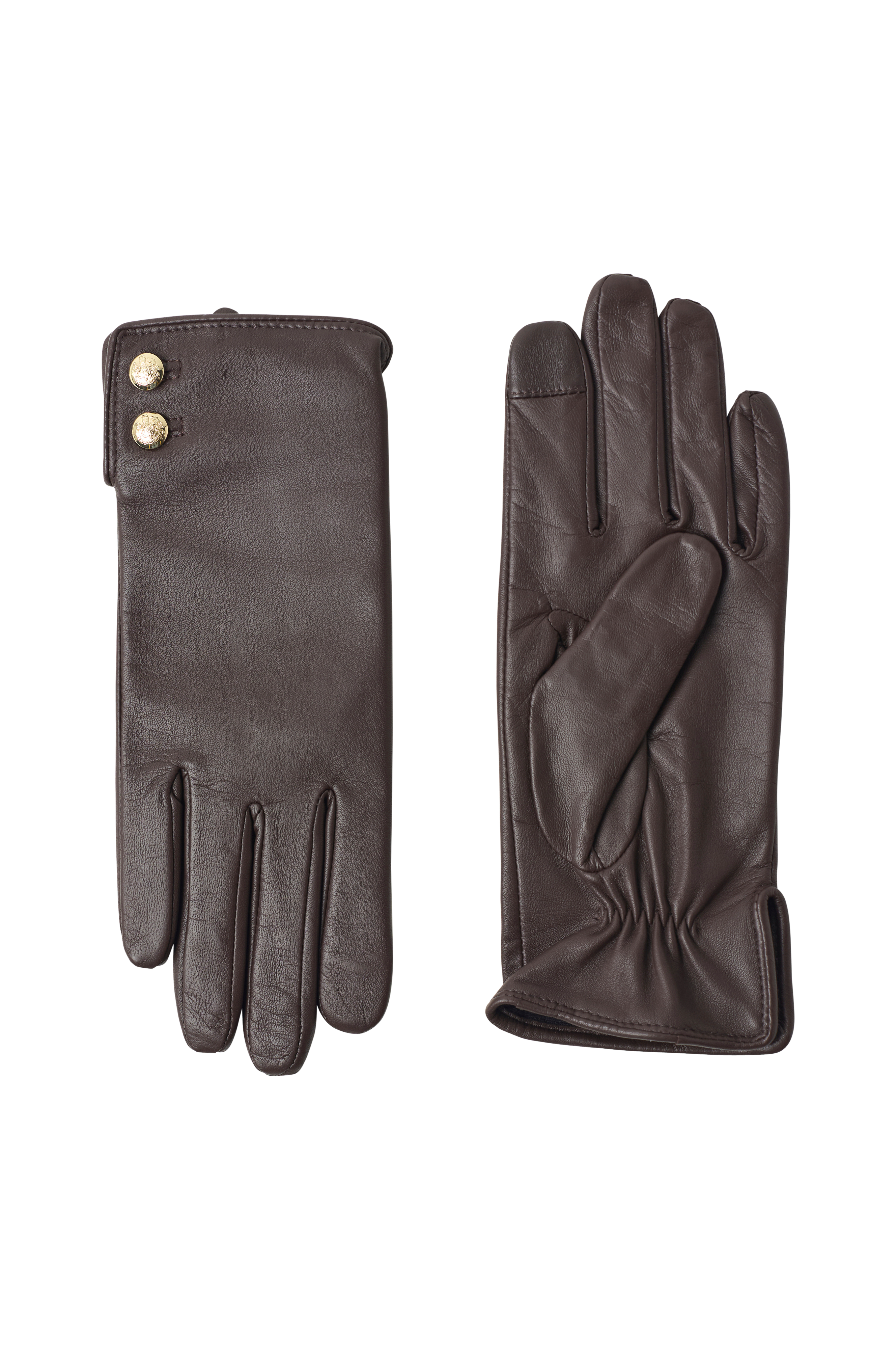 • Handsker i læder• To guldfarvede, dekorative knapper ved håndleddet• Elastik under håndleddet• Børstet inderside under håndleddet