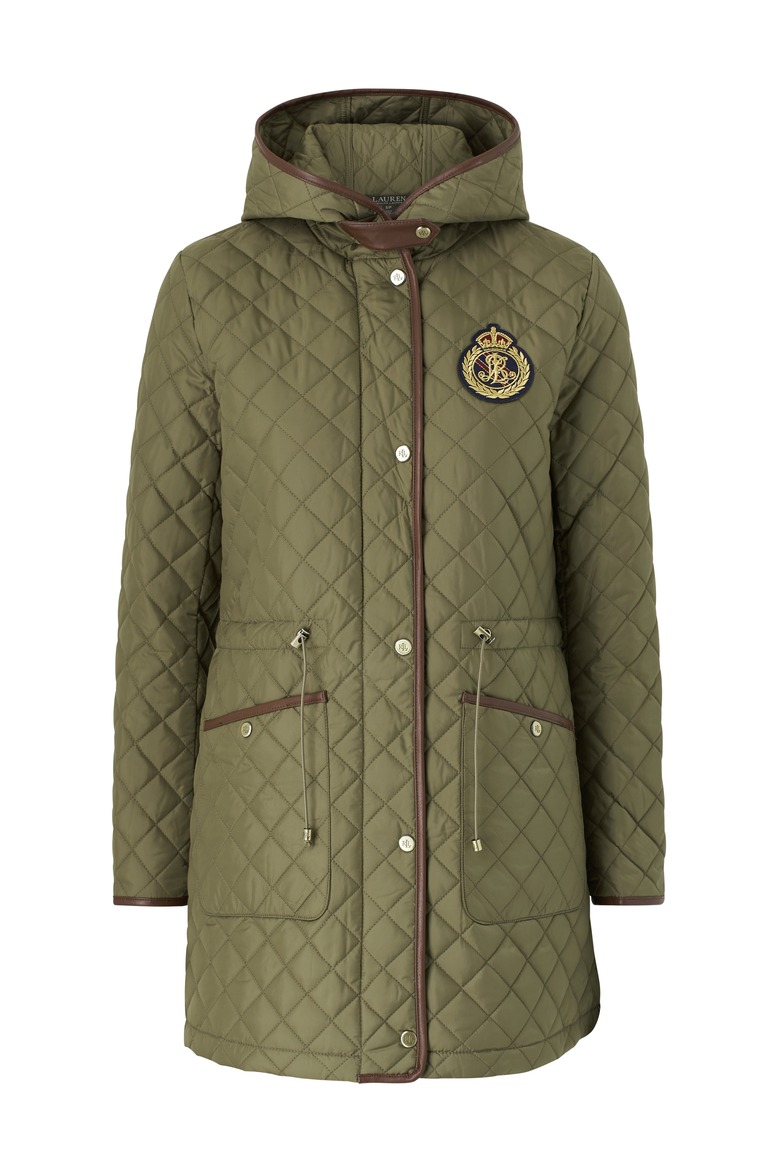 • Quiltet, let foret model • Knaplukning foran med lynlås og trykknapper • Hætte med flap foran • Applikation på brystet • Træksnørre med stopper ved taljen • Lommer med trykknap • Detaljer i imiteret læder • Mønstret for • Længde: 80 cm i størrelse S