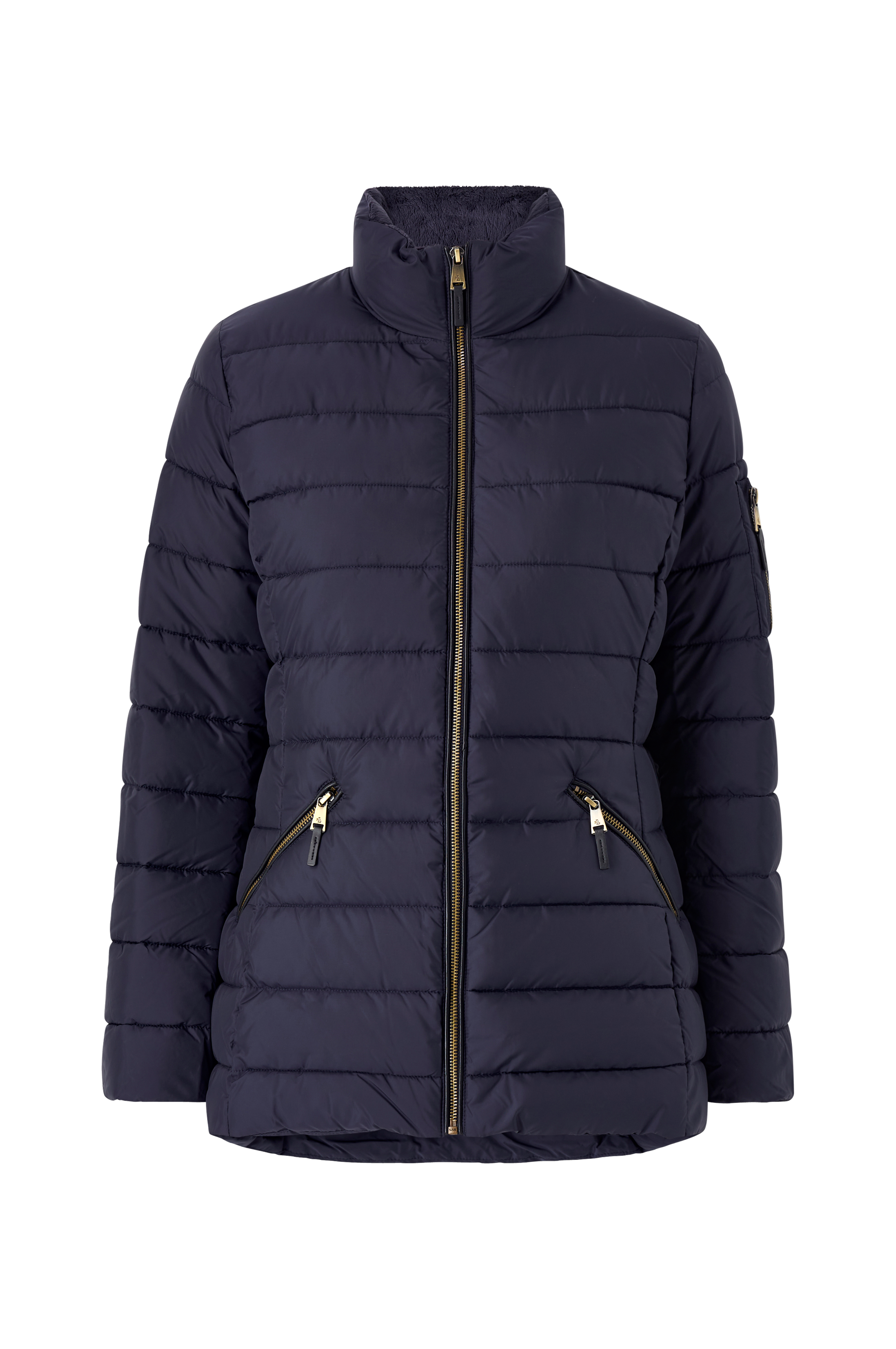 • Quiltet, foret jakke• Blødt, varmt for i teddy• Vævet, glat for i ærmerne• Høj krave med teddyforing• Lynlås• To lynlåslommer nederst• En lynlåslomme på det ene ærme• Justérbar talje med trykknapper i siderne• Længde: 72 cm i størrelse S