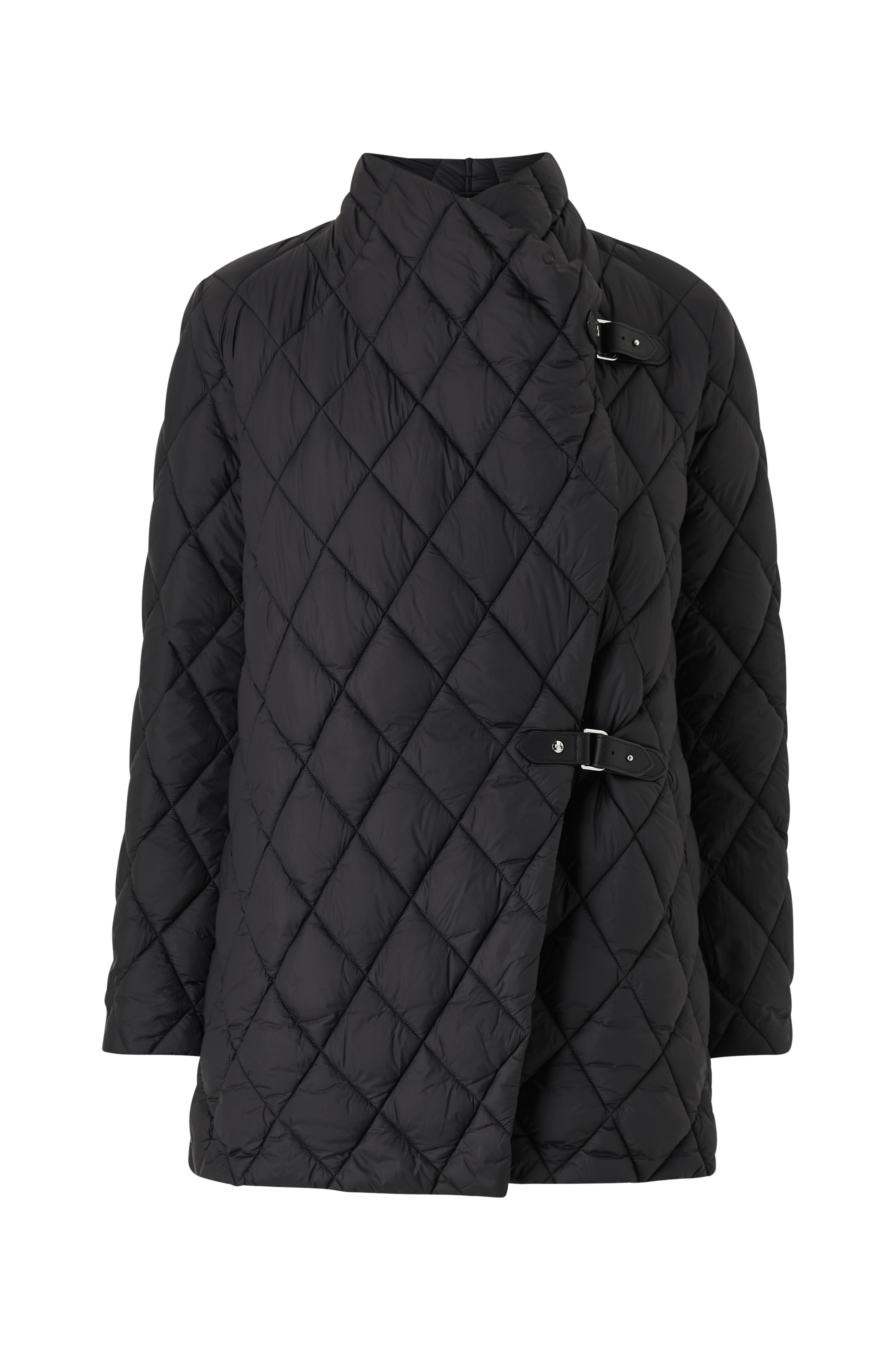 • Quiltet, foret jakke• A-linje design• Høj krave• Slå-om design• Lukning med to spænder i imiteret læder• Sidelommer• Længde: 79 cm i størrelse S