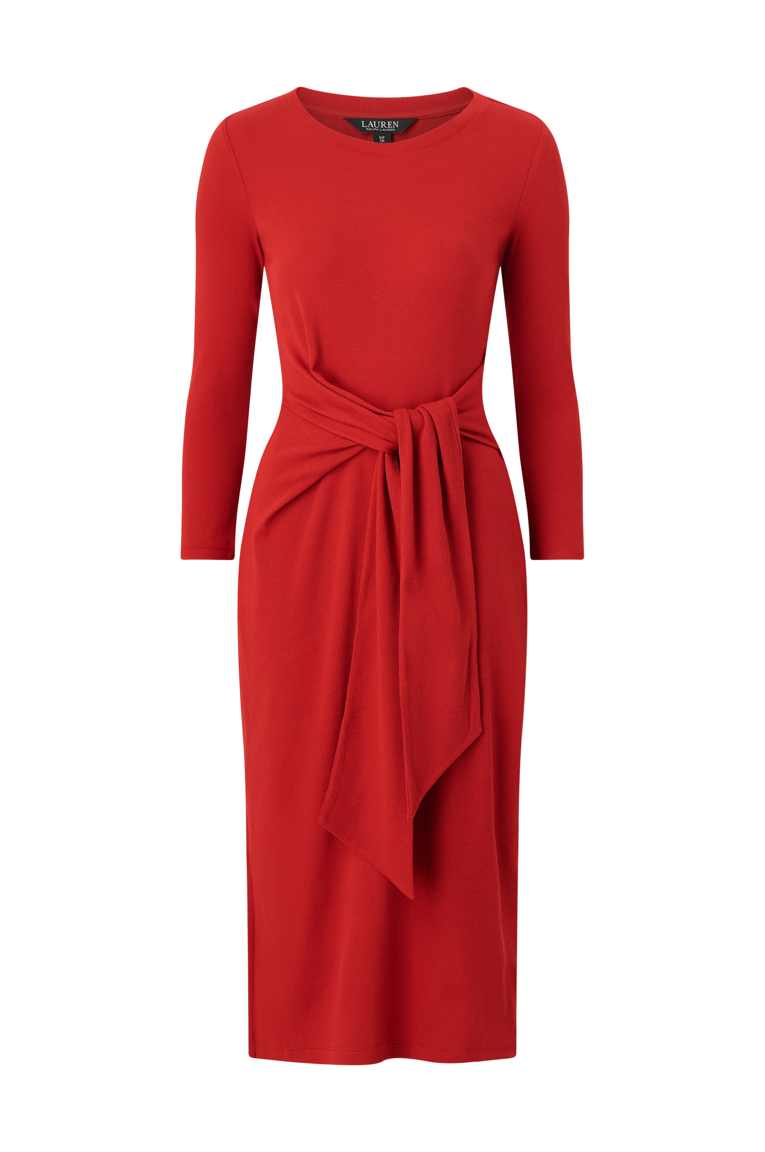 • Lang, figurformede model i elastisk bomuldsmiks• Rund, ribbet halsudskæring• 3/4 lange ærmer• Defineret talje med bredt, syet bindebælte i siderne• Slids nederst i den ene side• Længde: 119 cm i størrelse S