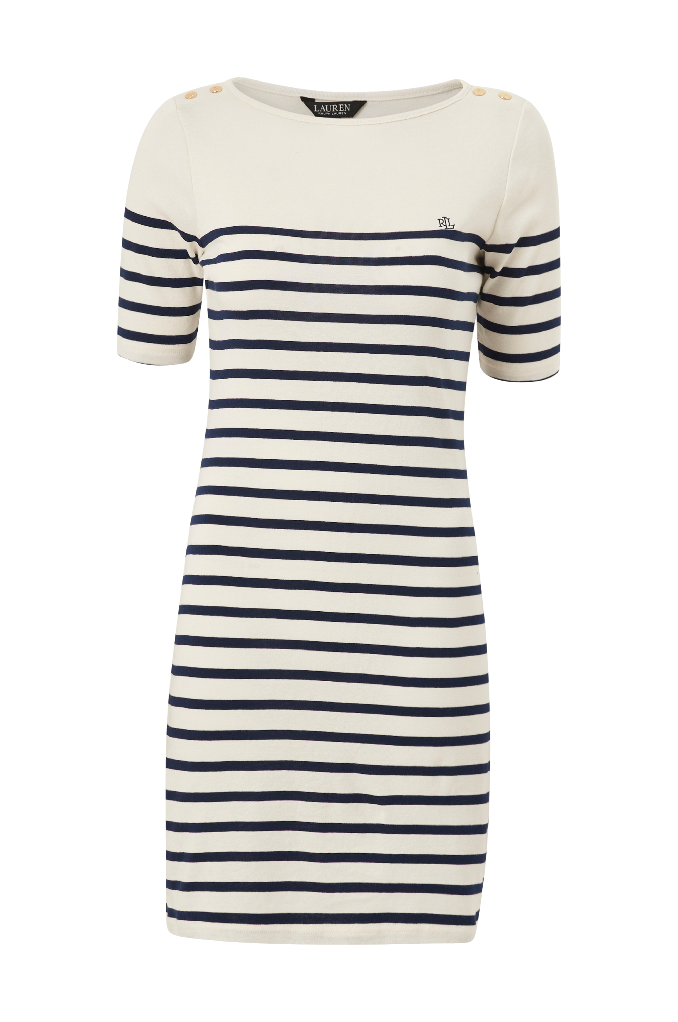 • Figursyet kjole i bomuldsjersey• Korte ærmer• Dekorative, guldfarvede knapper på skuldrene• Lille, broderet logo på brystet• Længde: 87 cm i størrelse S