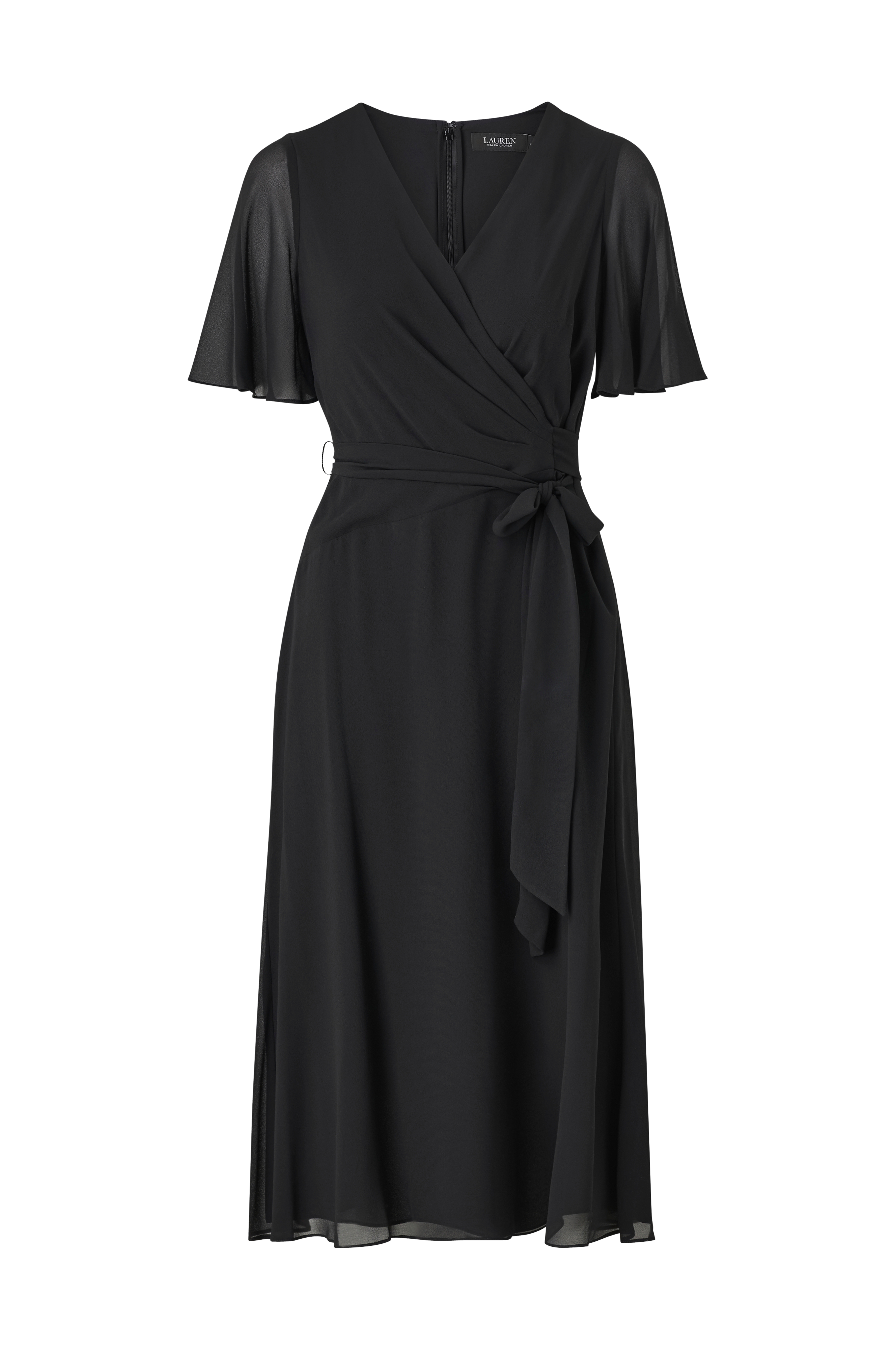 • Kjole i chiffon• Slå-om design på toppen• Korte, transparente sommerfugleærmer• Bindebælte• Skjult lynlås i ryggen• Tyndt for• Længde: 113 cm i størrelse 36