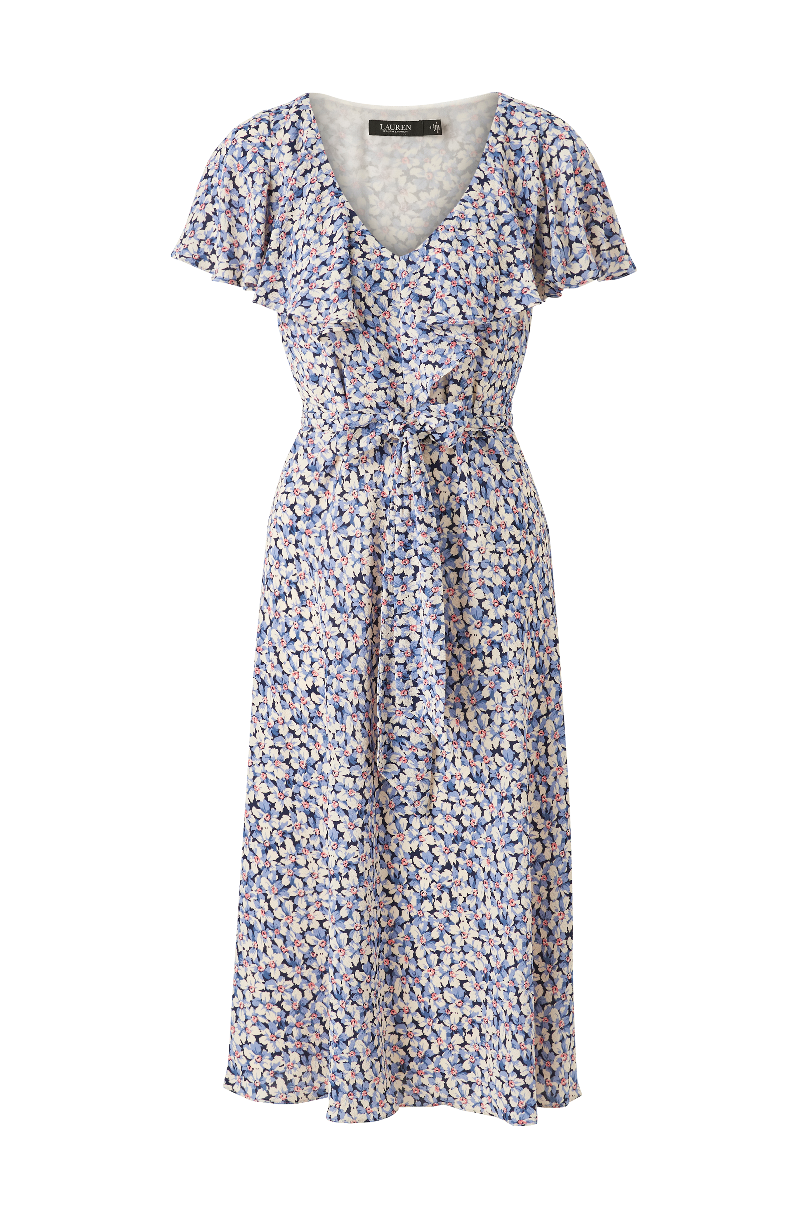 • Lang model i crepe• V-formet halsudskæring med bred volant• Kort, bredt ærme• Afskåret talje med bindebælte• Foret• Længde: 118 cm i størrelse 36