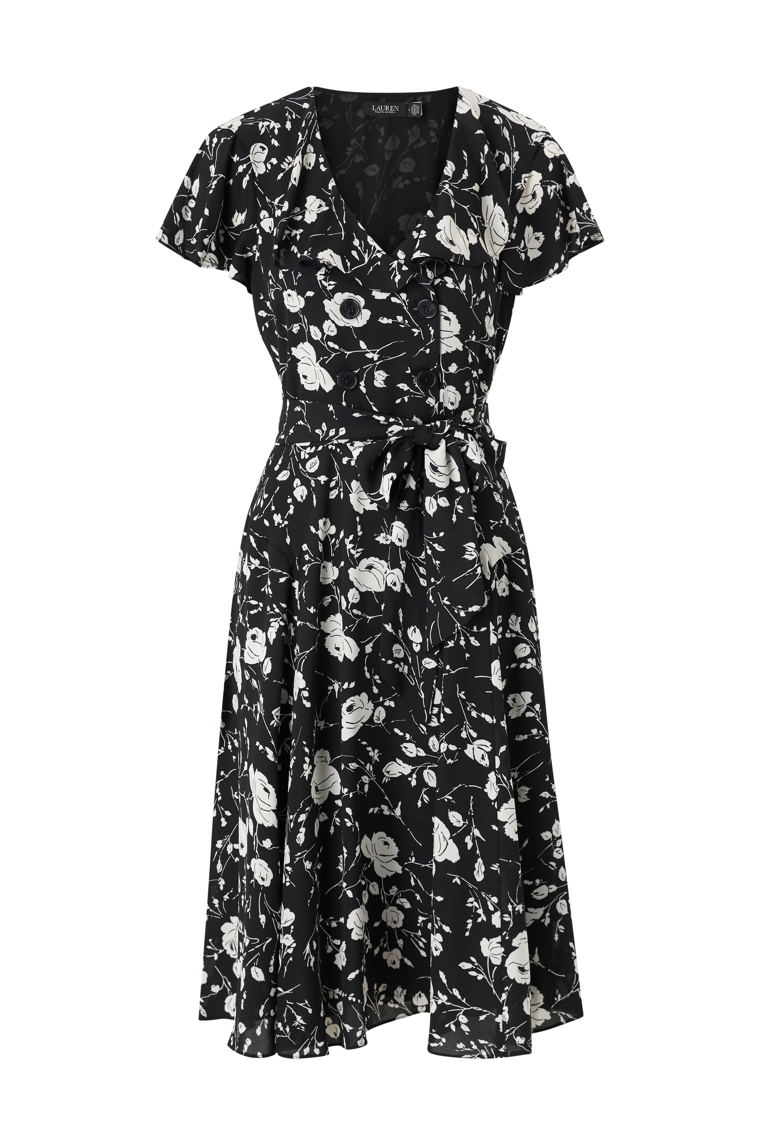 • Mønstret kjole• V-udskæring med volant• Dobbelt knaplukning• Korte flagrende ærmer• Bindebælte• Skjult lynlås i siden• Tyndt for• Længde: 110 cm i størrelse 36