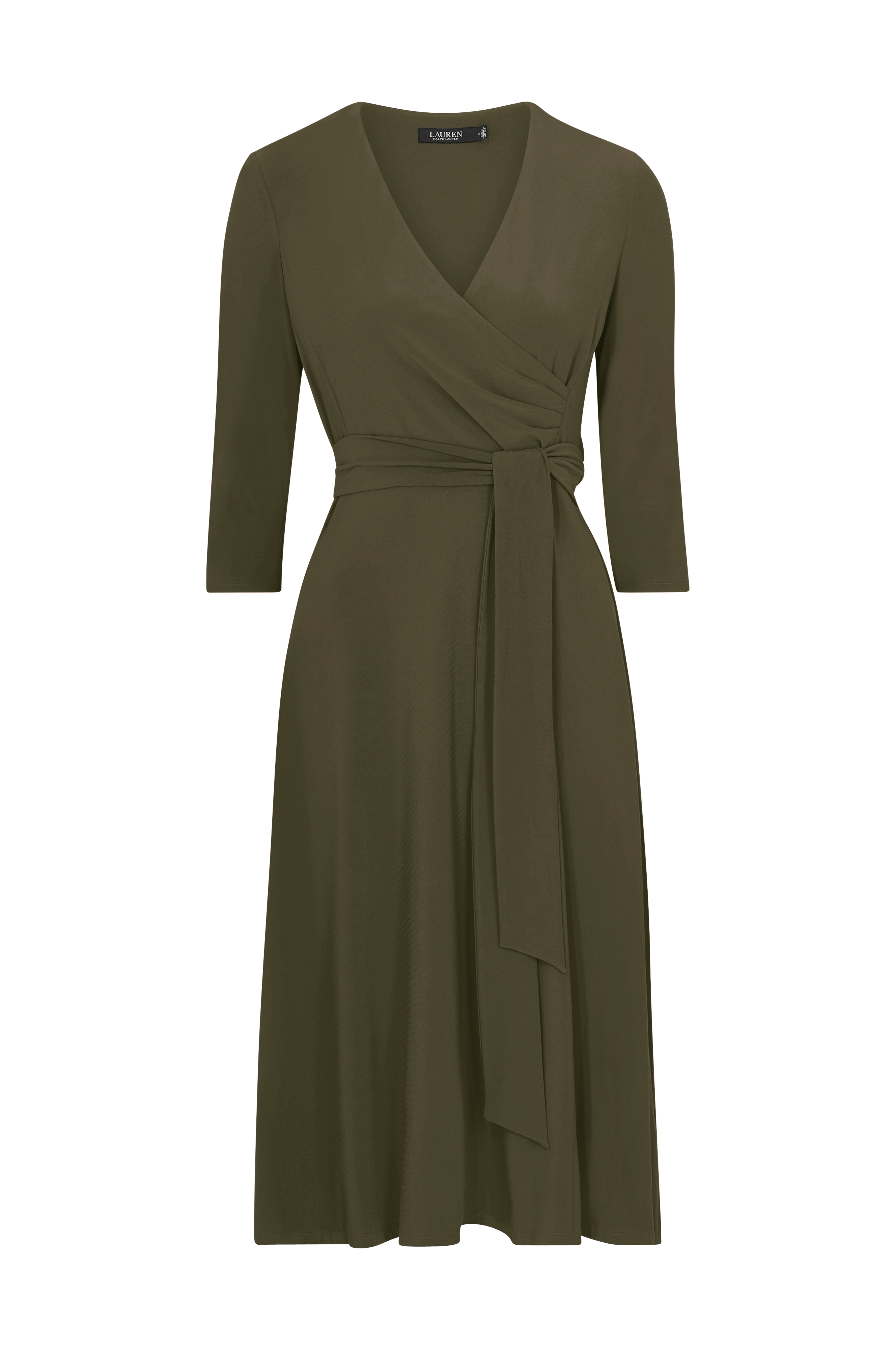• Stilren midikjole i jersey• V-udskæring med slå-om• Lægge i siden• 3/4 lange ærmer• Bindebælte ved taljen• Længde: 115 cm i størrelse 36