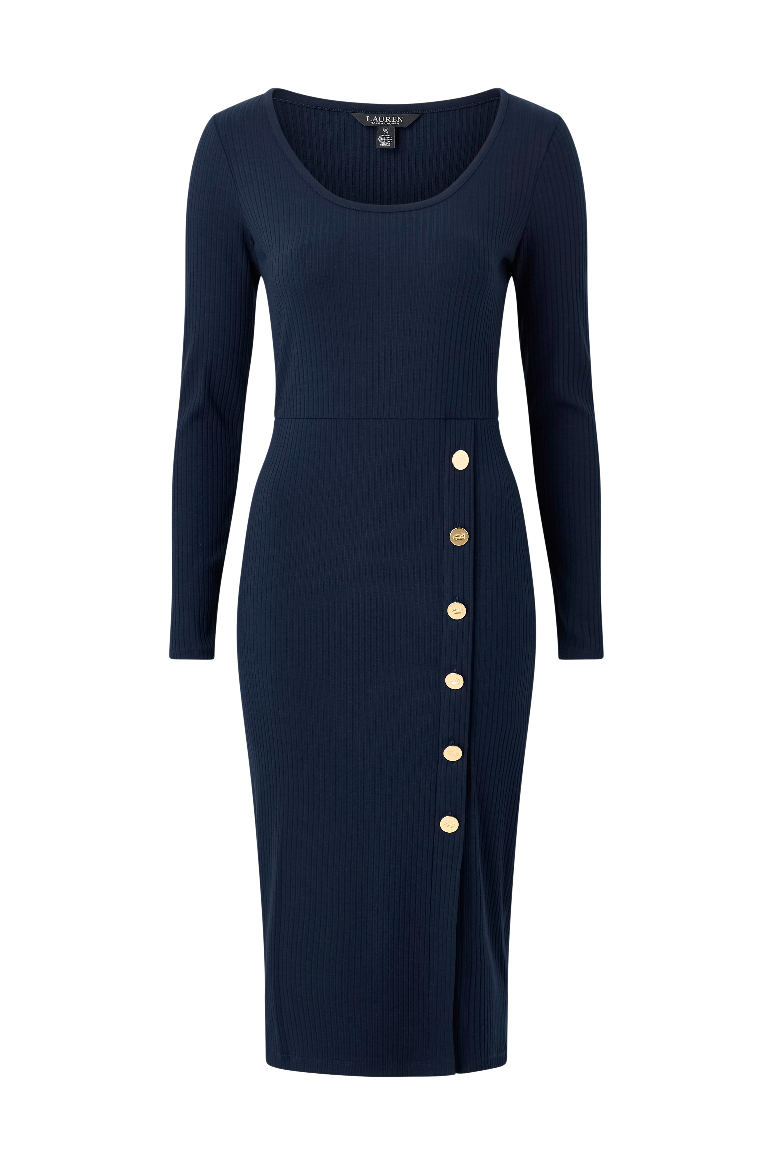 • Blød, ribstrikket kjole i viskoseblanding• Rund, bred halsudskæring• Lange ærmer• Defineret talje• Slids med dekorative, guldfarvede knapper i den ene side• Længde: 110 cm i størrelse S
