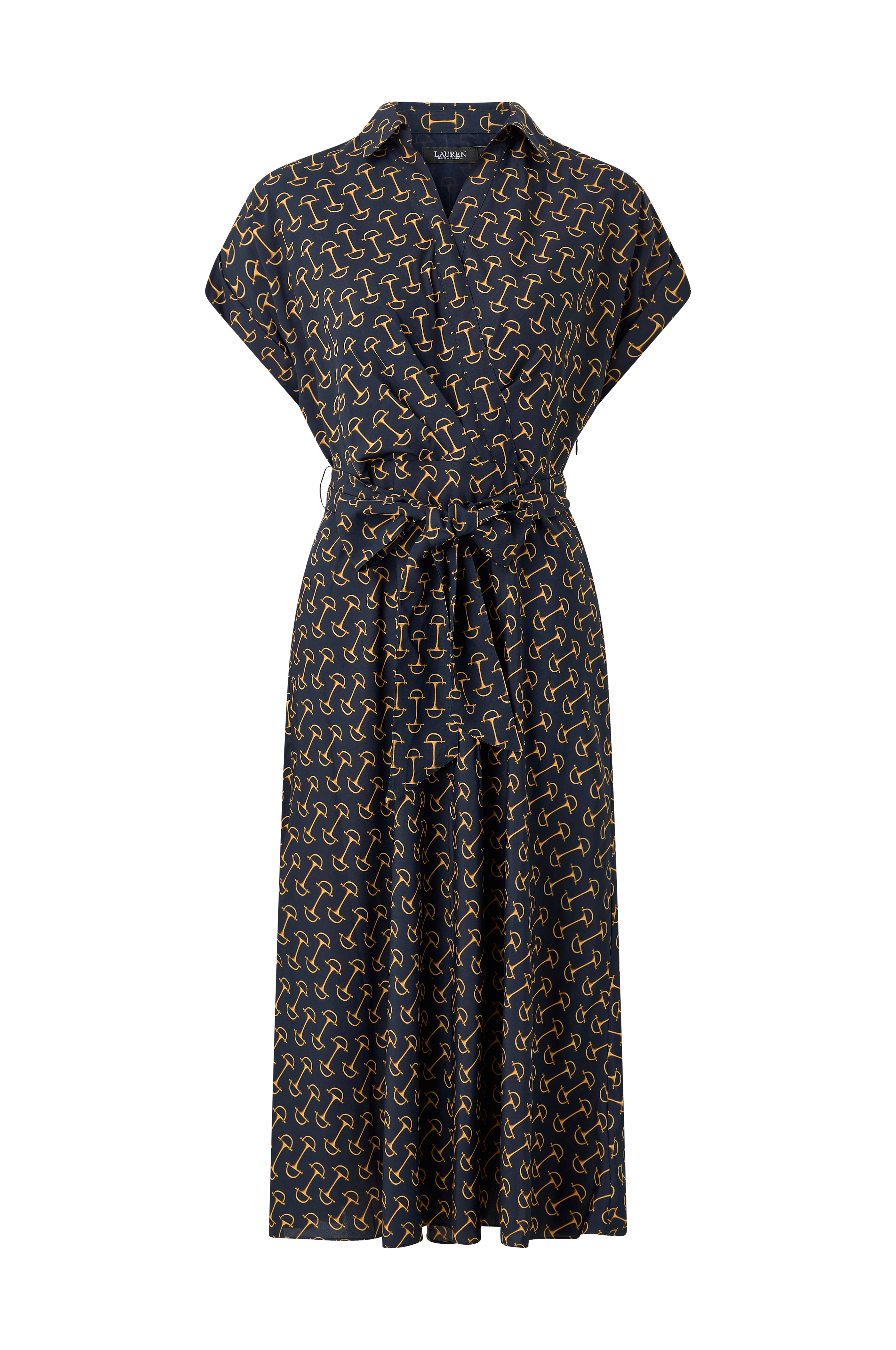• Mønstret kjole med krave• Slå-om design på toppen• Korte ærmer• Foldede ærmeafslutninger med stropdetalje• Bindebånd ved taljen• Længde: 117 cm i størrelse 36