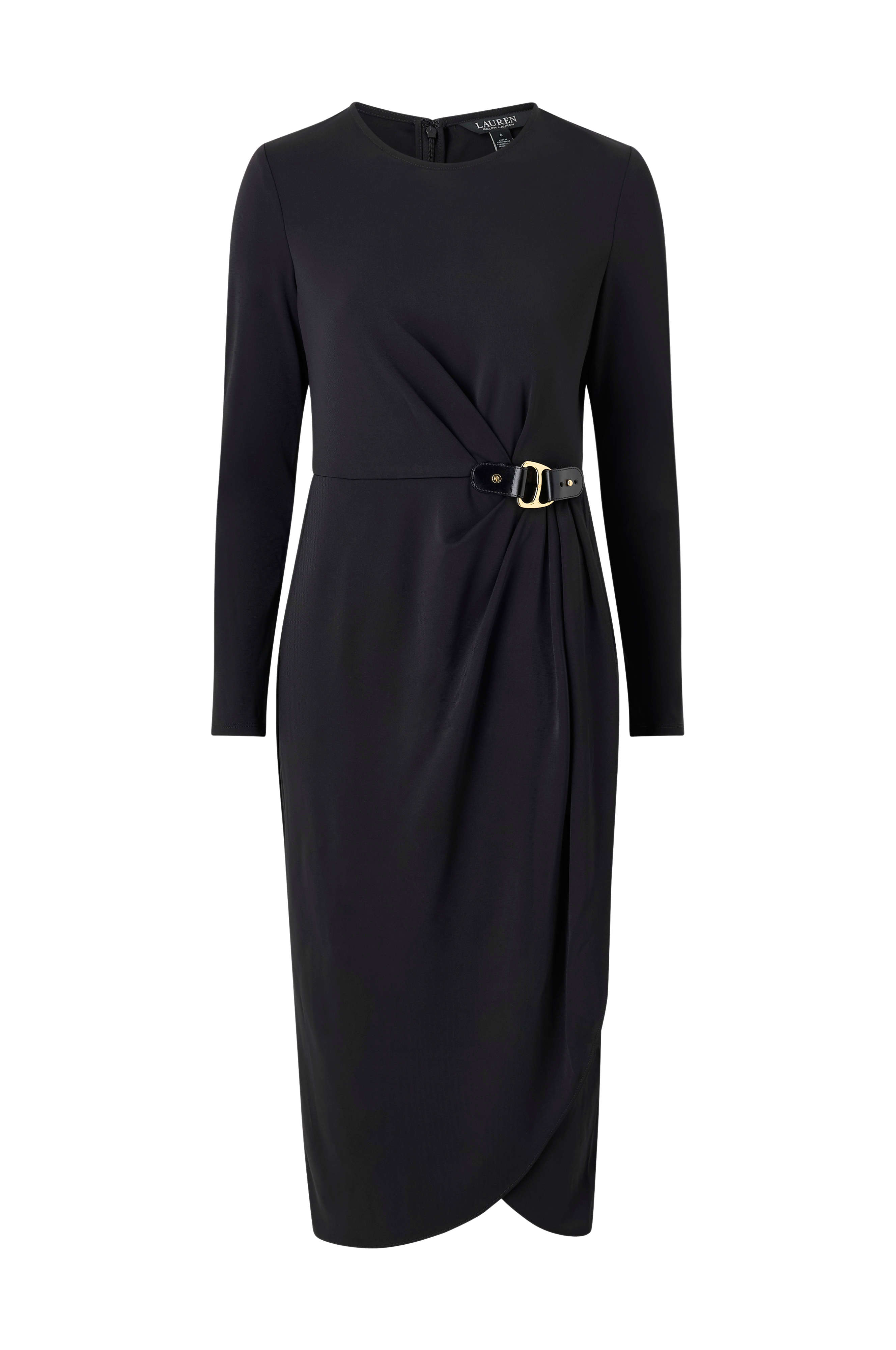 • Langærmet kjole med rund halsudskæring• Lynlås i nakken• Guldfarvet, dekorativt spænde ved taljen• Slå-om design ved taljen og nederst• Længde: 120 cm i størrelse 36