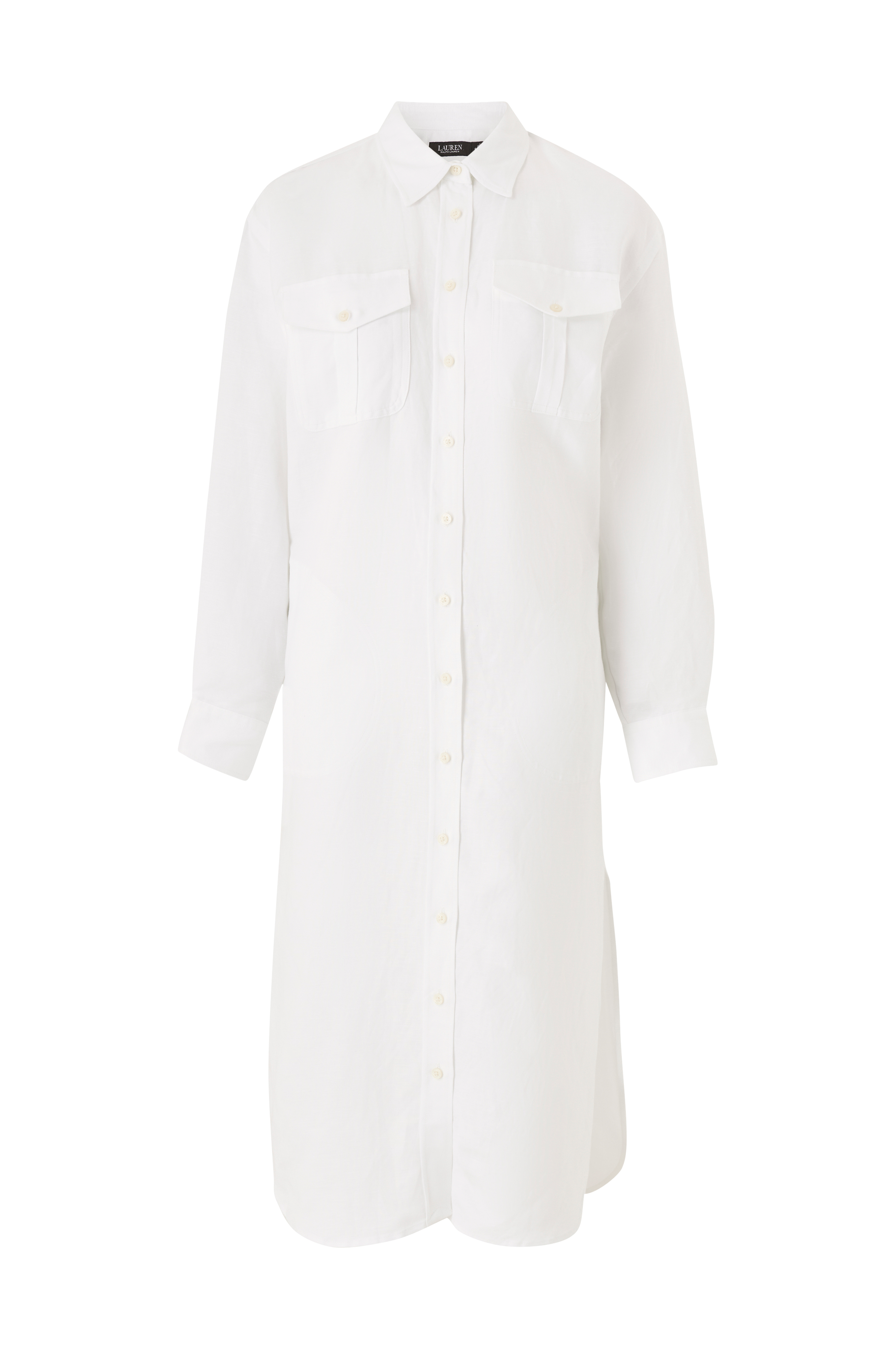 • Kjole i hør og viskose• Knapper hele vejen frem• To brystlommer med knapbare låg• Lange ærmer• Manchet med en knap• Slidser nede i siderne• Bølgeformet detalje bagpå• Længde: 125 cm i størrelse 36