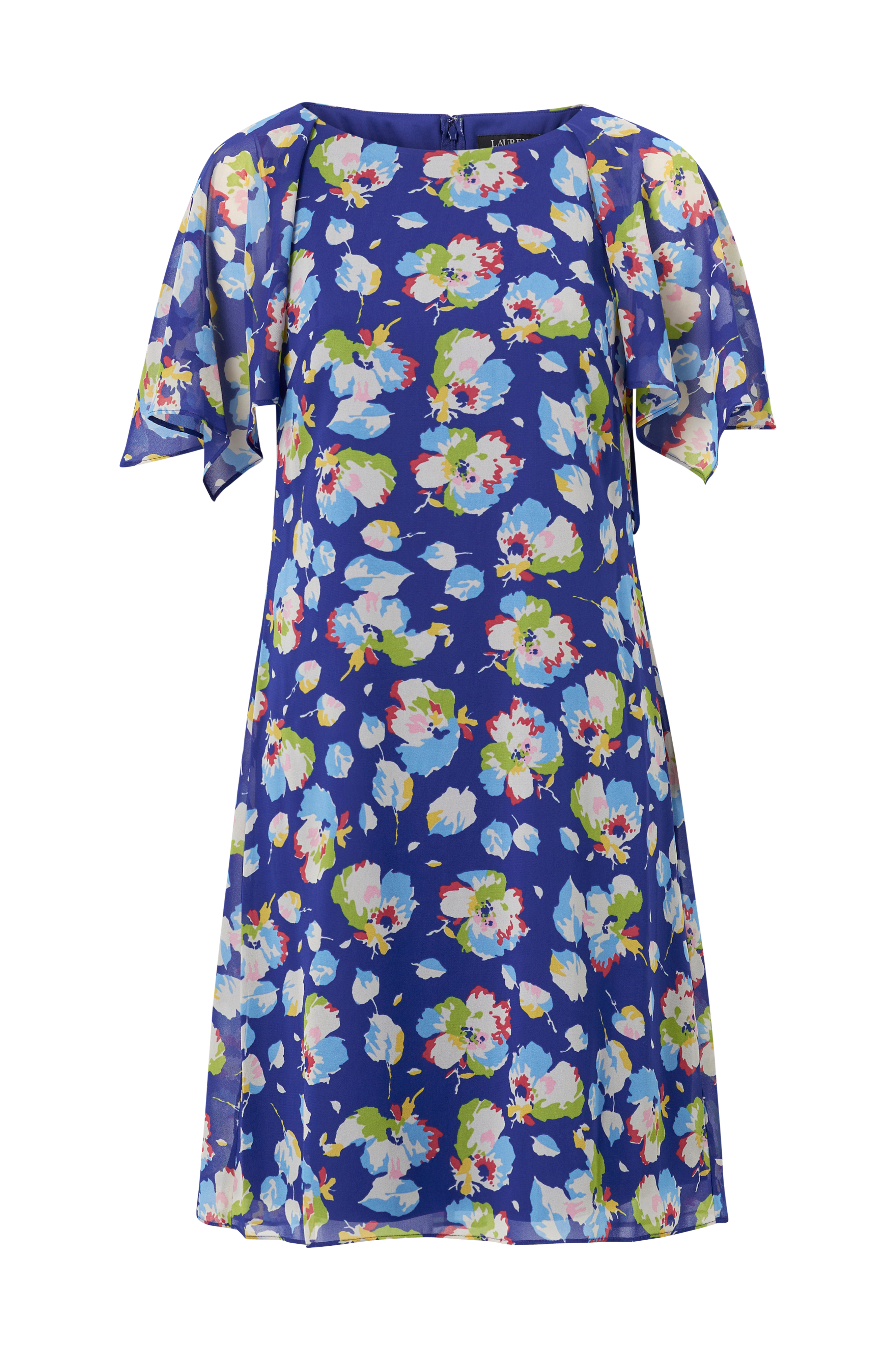 Kjole i A-formet model af chiffon med vide ærmer som er åbne på undersiden. Rund hals med skjult lynlås i ryggen. Længde ca. 96 cm i str. 36.