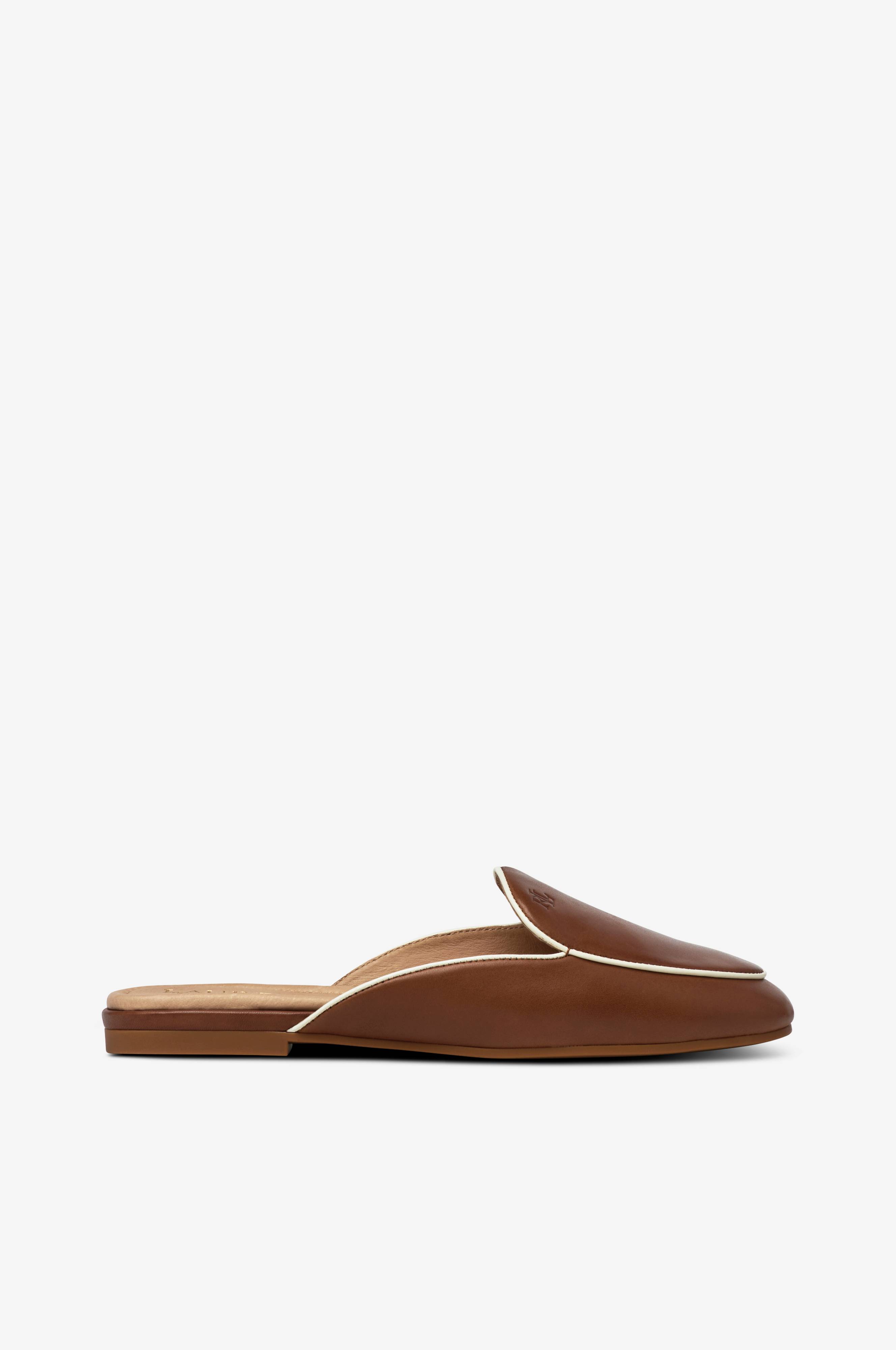 Flade mules med dækket tå. Helt i læder med kontrastfarvet kantsøm. Ydersål i gummi.